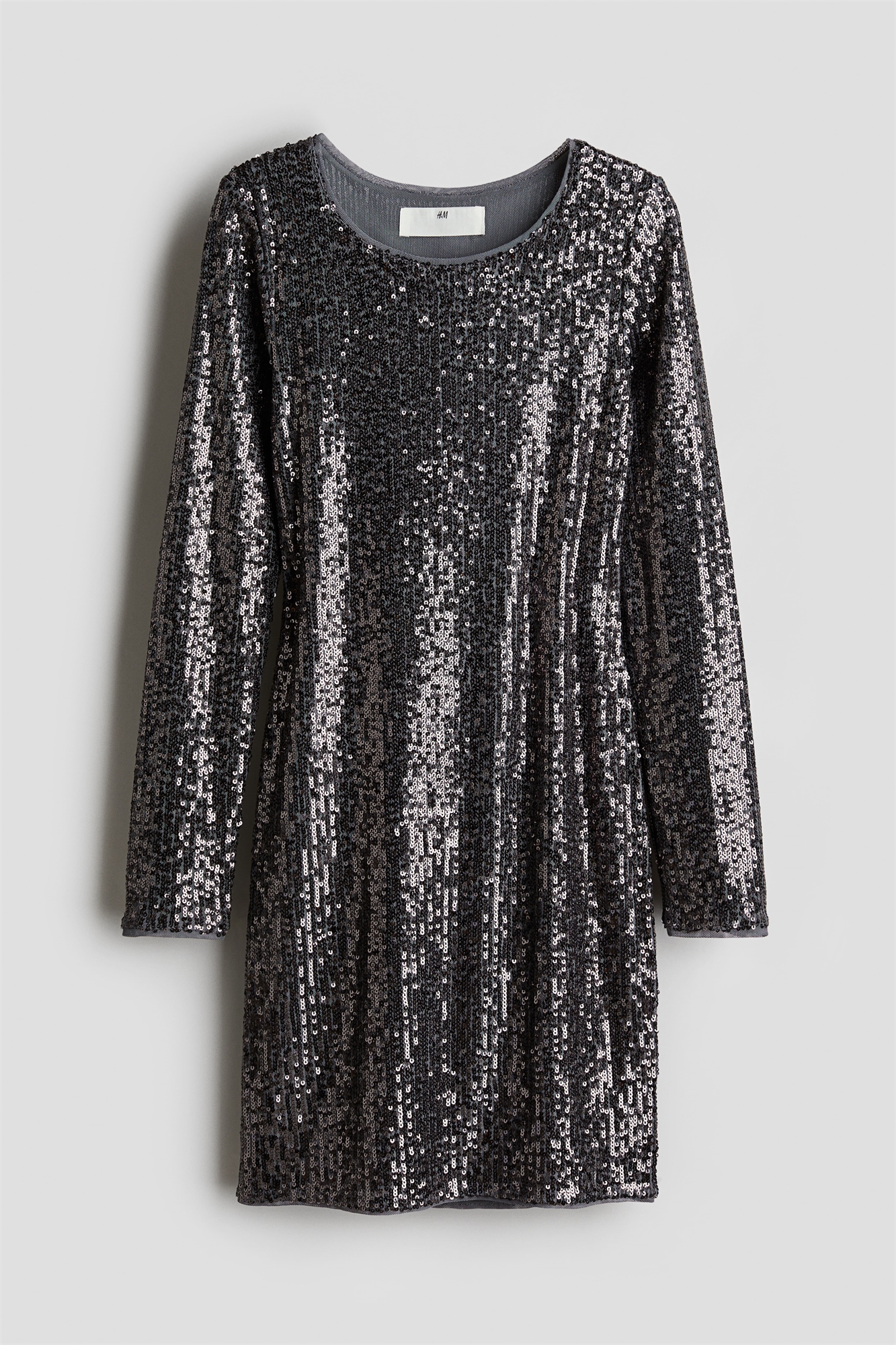 Платье из блестящей сетки с круглым вырезом и длинными рукавами. На подкладке.