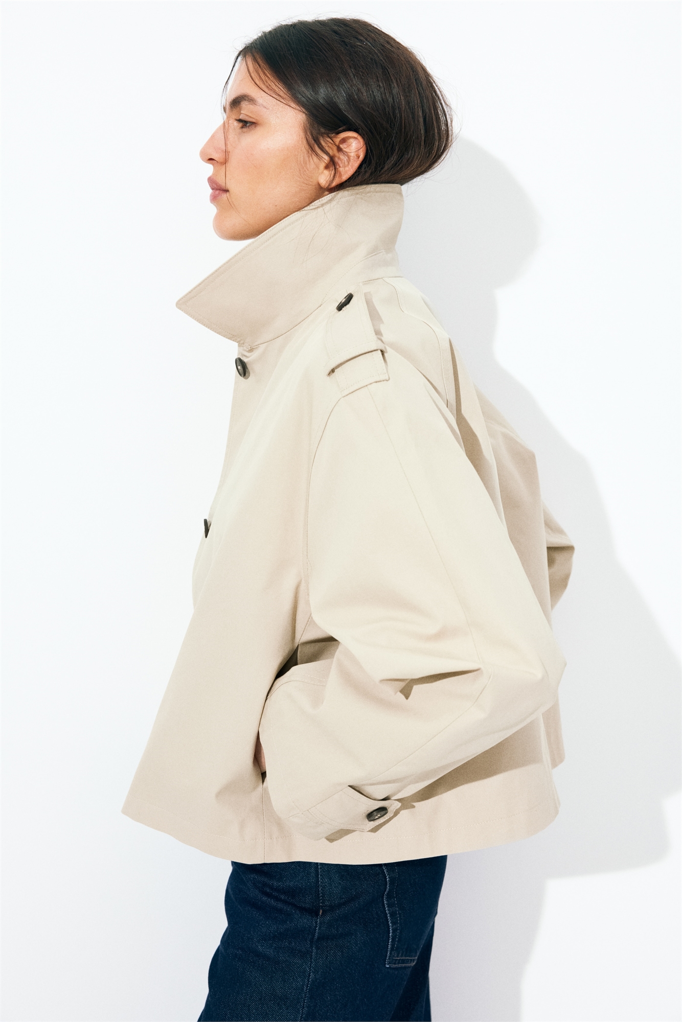 Короткая куртка оверсайз из хлопковой саржи с воротником, видимой верхней пуговицей и потайными кнопками спереди. Неприметные боковые карманы, погоны на пуговицах и вкладка с пуговицей на манжетах. На подкладке.