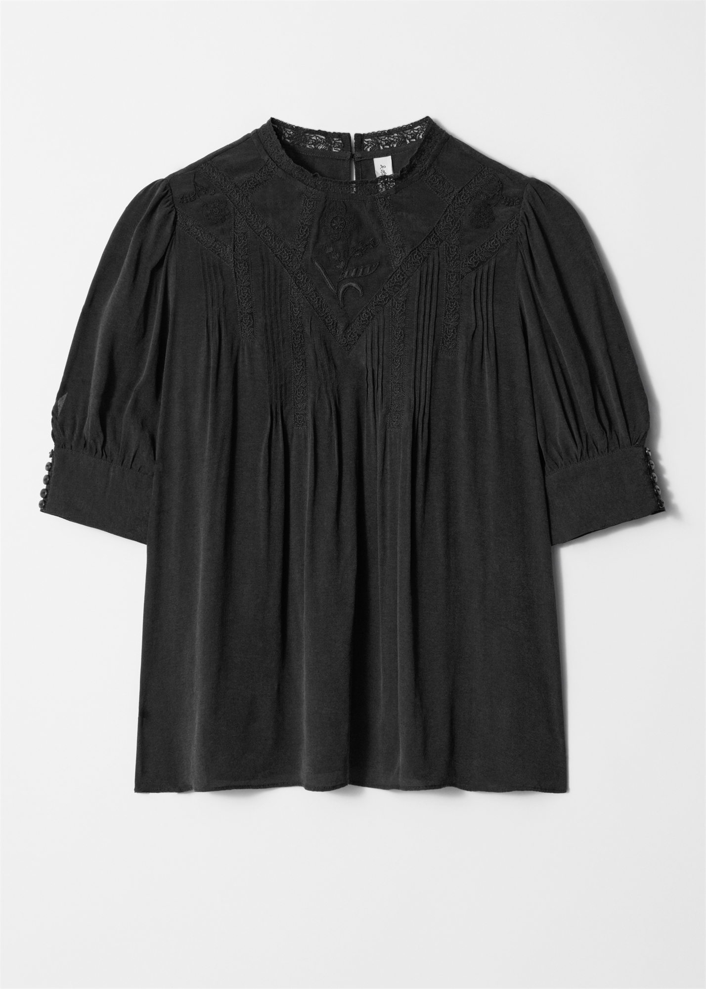 Блузка свободного силуэта со сборками и замысловатыми кружевными деталями на груди. Классический воротник-бант и короткие драпированные рукава с манжетами на пуговицах. Застежка на пуговицах у горловины. Длина блузки: 59,3 см / 23,3 дюйма (размер S)