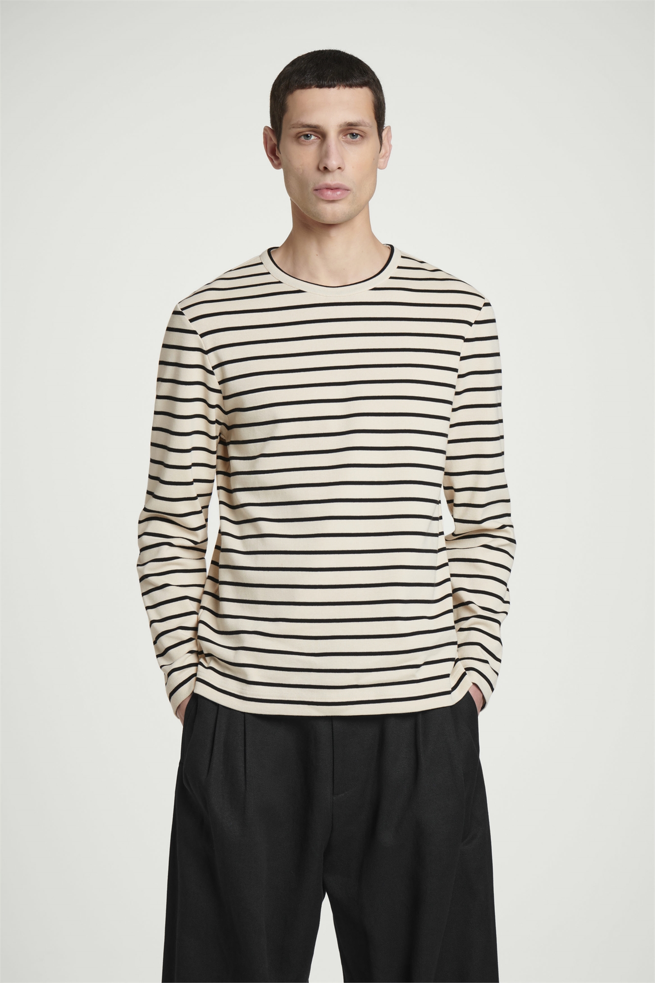 Элегантные вещи из гардероба - краеугольный камень коллекции COS. Изготовленная из мягкого хлопка-джерси, эта футболка с длинными рукавами имеет классический вырез и украшена контрастными полосками, которые придадут изысканности иным скромным образам. Регулярный крой Оболочка: 100% хлопок. Без учета отделки / Машинная стирка Длина по спинке для размера M составляет 70 см / Модель носит размер M