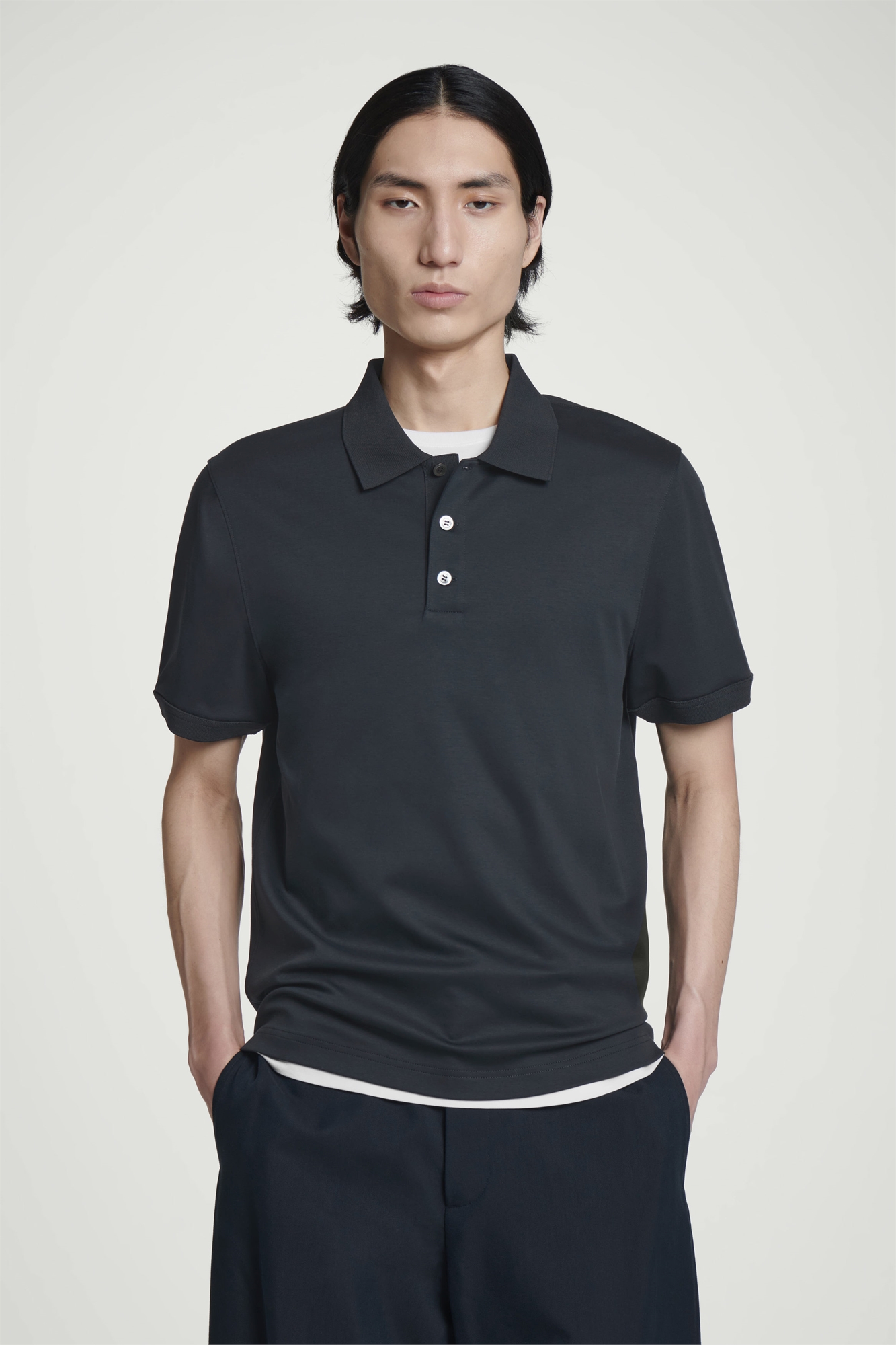 Рубашка-поло COS - основа капсульного гардероба. Эта рубашка, представленная в универсальном темно-синем цвете, сшита из мерсеризованного хлопка высшего качества и имеет классическую форму, которую легко сочетать с джинсами и одеждой. Ребристый воротник, перламутровые пуговицы и короткие рукава. Регулярный крой Застежка на пуговицы Материал: 100% хлопок. Без учета отделки / Машинная стирка Длина по спинке для размера M составляет 67,7 см / Модель носит размер M