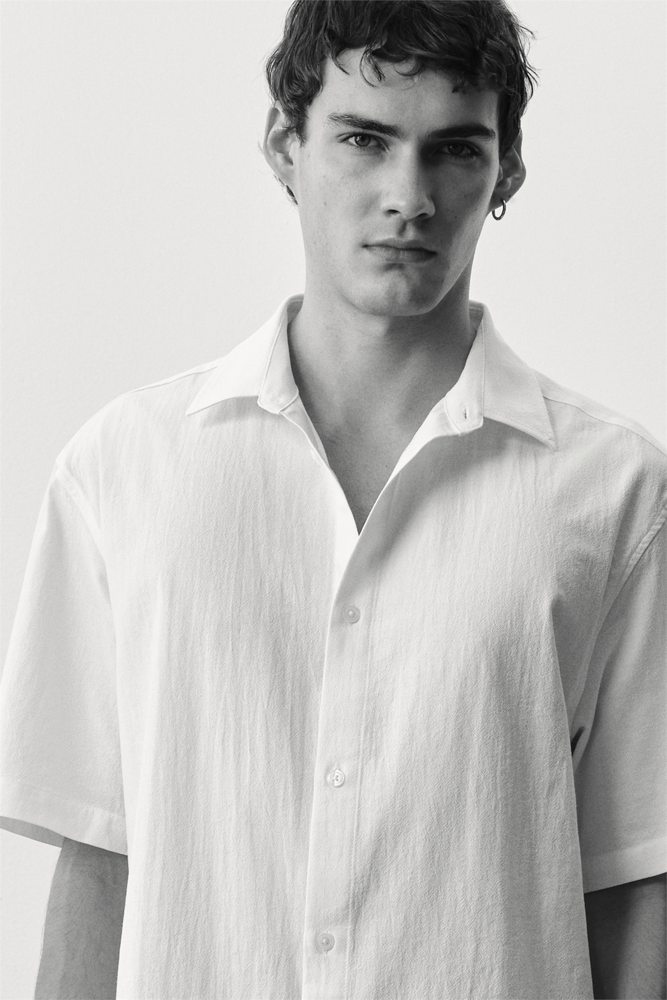 Рубашка с короткими рукавами из фактурного материала с отложным воротником, французским передом, ярмом сзади и прямым подолом с разрезом с каждой стороны. Регулярный крой для комфортной носки и классического силуэта.