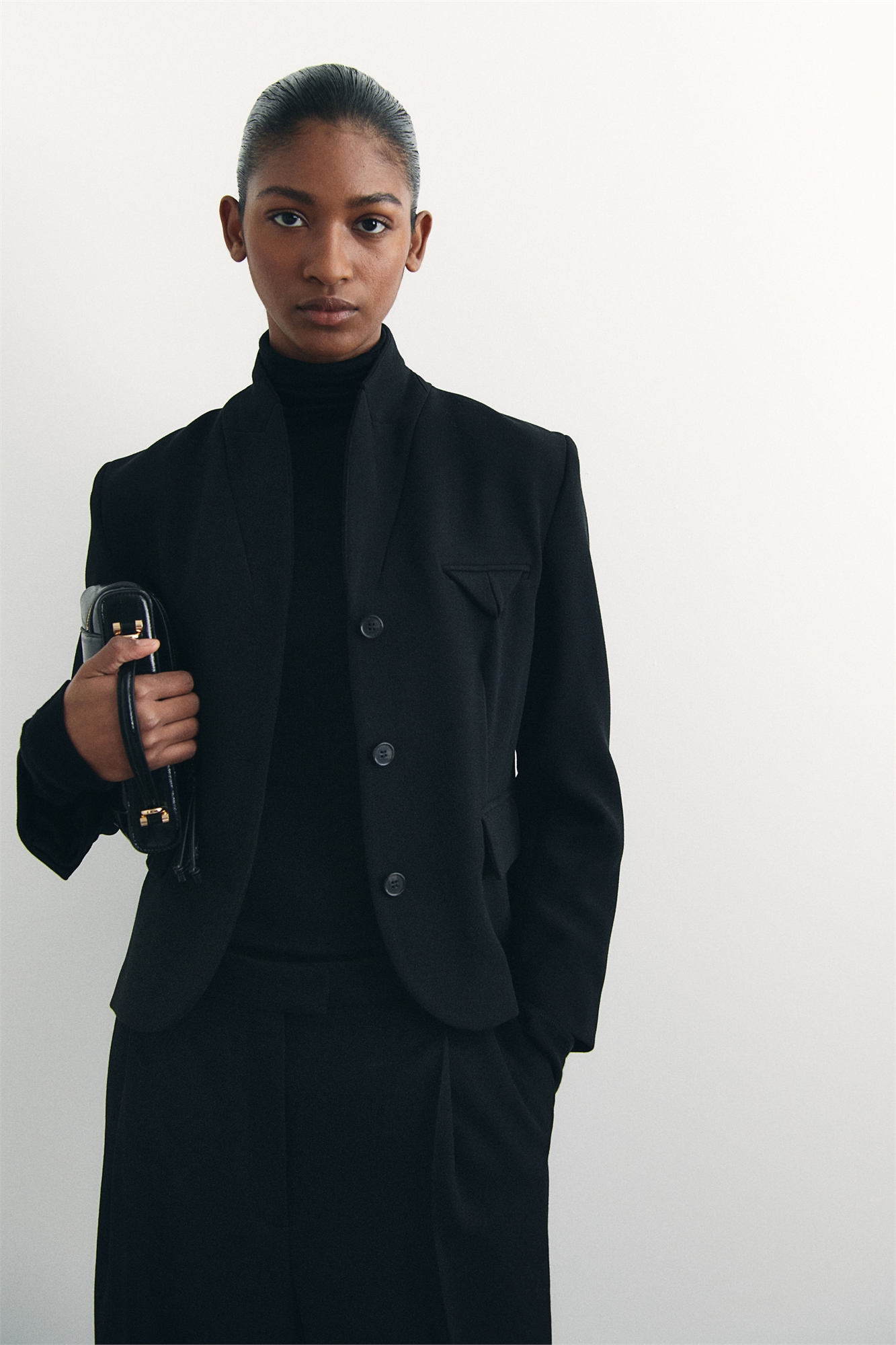 Однобортный блейзер из тканого материала с пикообразными лацканами и пуговицами спереди. Нагрудный карман с декоративной треугольной деталью, формирующие вытачки на талии и накладные передние карманы с клапаном. Накладки на плечах и разрез с пуговицами на манжетах. На полуподкладке.