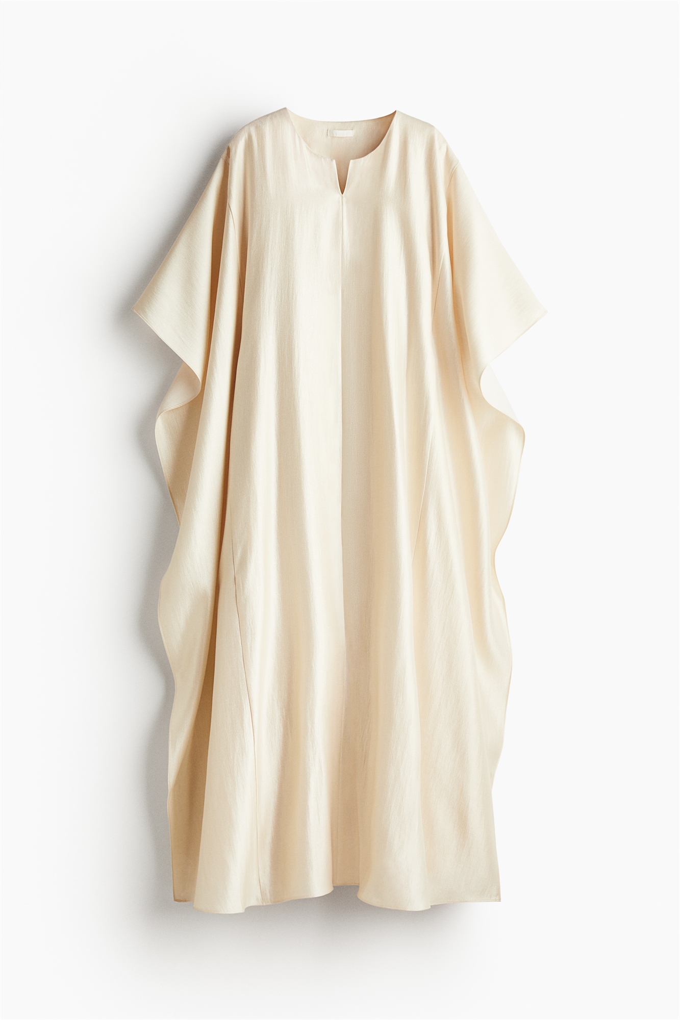 Длинное платье-кафтан свободного покроя из переливающегося материала с круглым вырезом и небольшой V-образной проймой спереди. Широкие рукава длиной 3/4, нижняя часть без рукавов и внутренние завязки придают силуэту стройность.