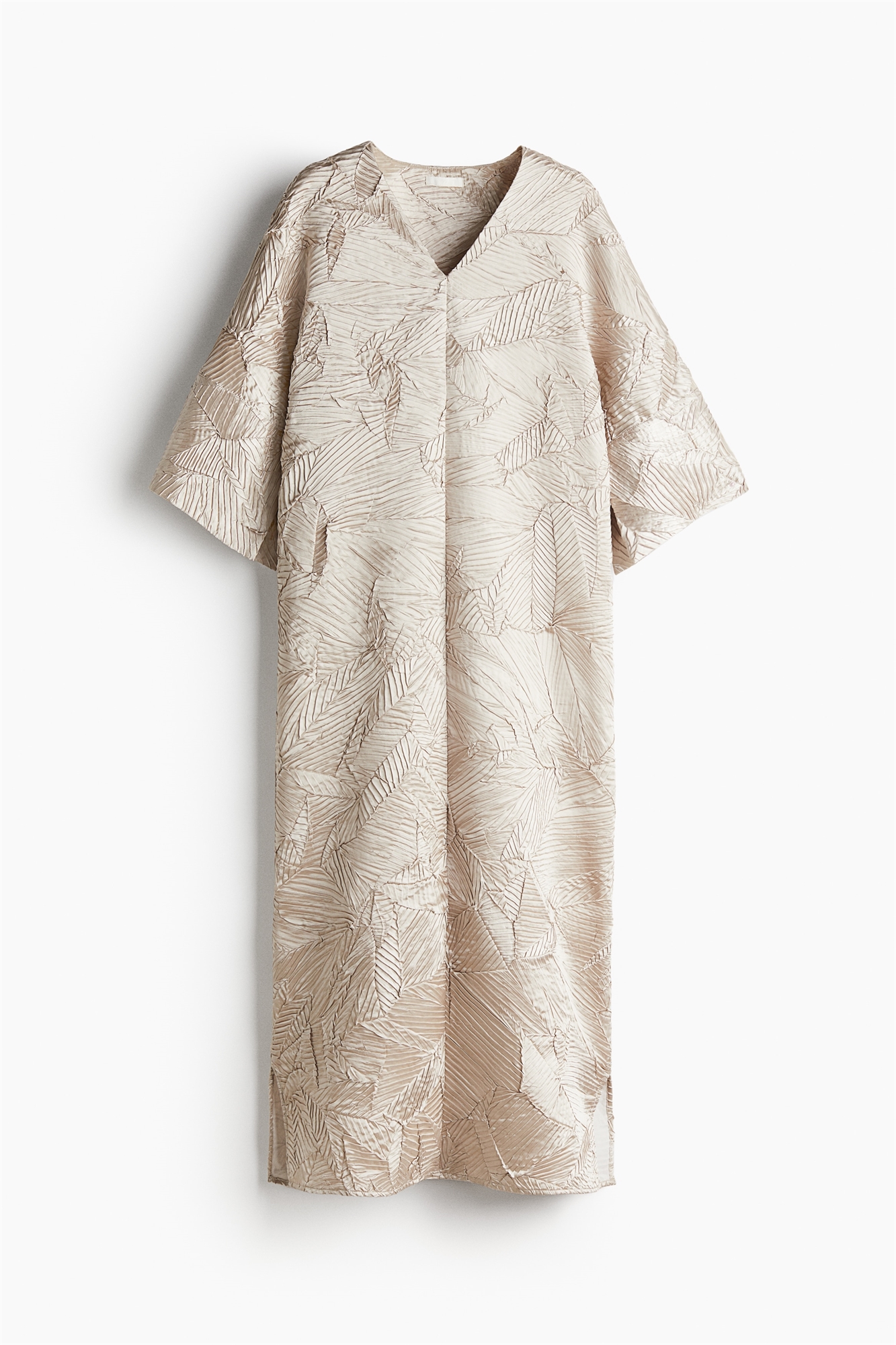 Свободное платье-кафтан длиной до колен из атласа плиссе с замысловатым фактурным узором в виде листьев. V-образный вырез, широкие рукава длиной 3/4 с разрезом на манжетах и подол прямого кроя с разрезом с каждой стороны. Без подкладки.