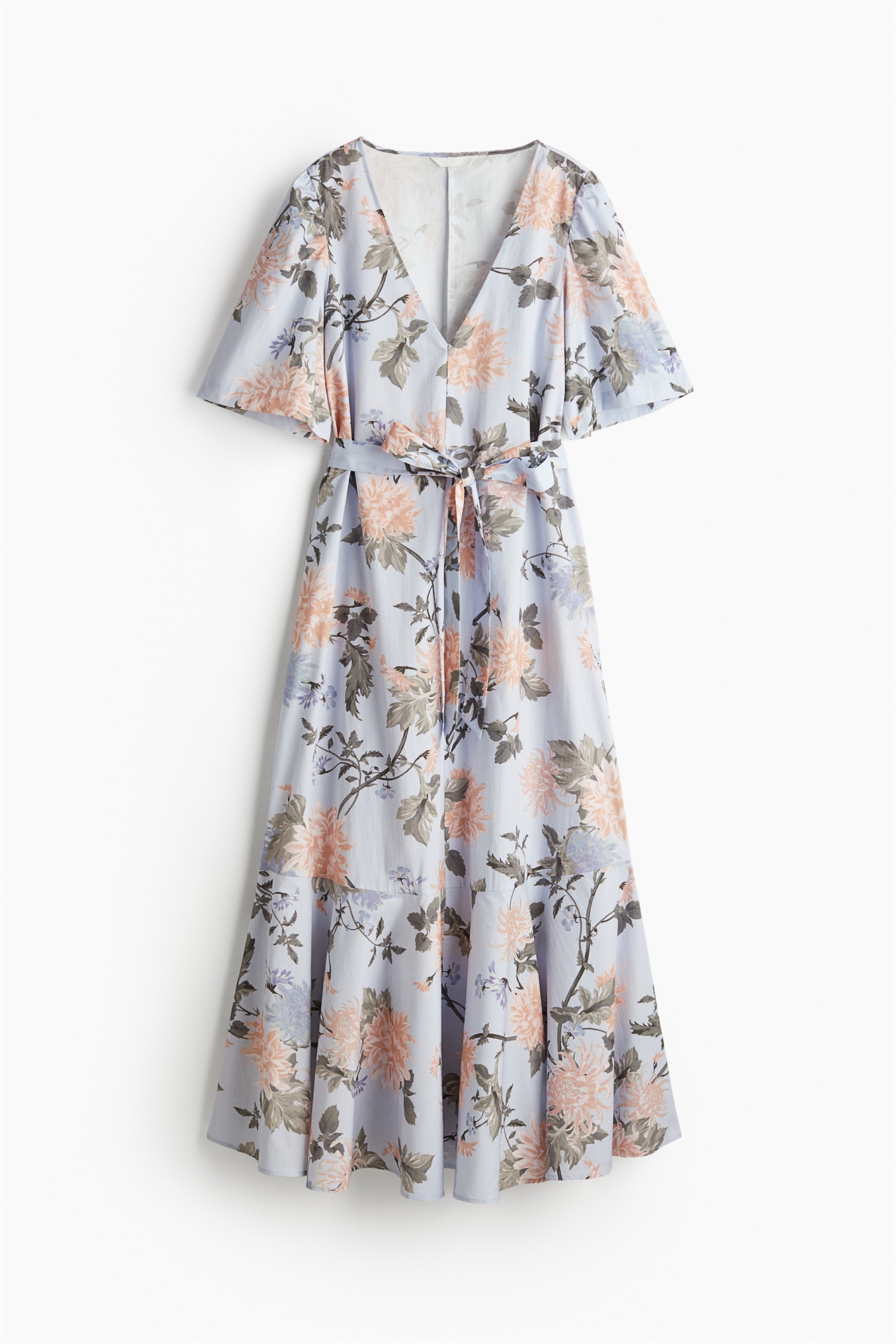 Платье длиной до щиколоток из хлопкового полотна с глубоким V-образным вырезом и короткими рукавами. Съемный пояс-завязка на талии и расклешенная юбка с широким воланом на подоле. Без подкладки.