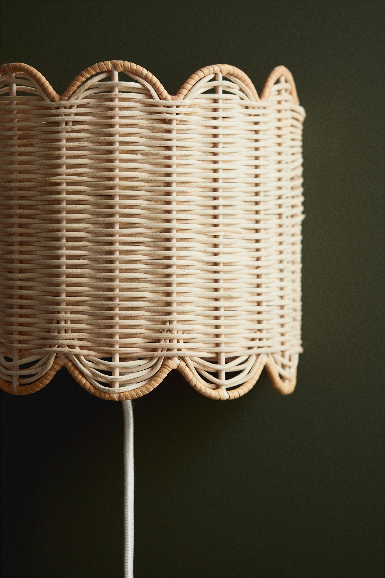 Настенный светильник из ротанга. Эта модель с волнистым краем излучает теплый, уютный свет. Металлический настенный кронштейн и кабель с текстильным покрытием, пластиковый выключатель. Для источников света с цоколем E14. Максимальная мощность светодиода 5 Вт. Лампочка в комплект не входит. Глубина 11,6 см. Высота 20,6 см. Ширина 22 см. Длина кабеля 200 см.