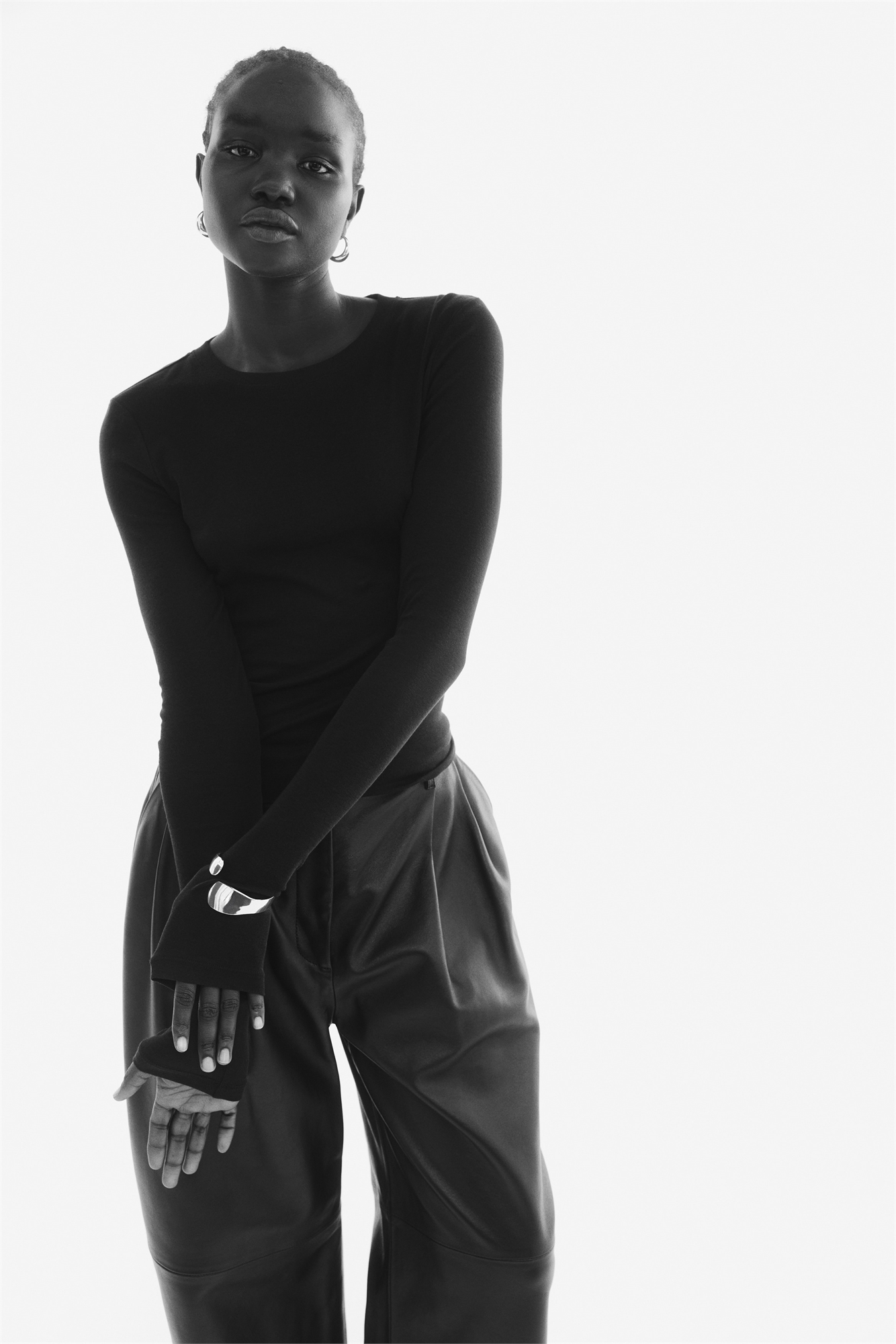 Облегающий топ из легкого хлопкового джерси пима с круглым вырезом и удлиненными рукавами.