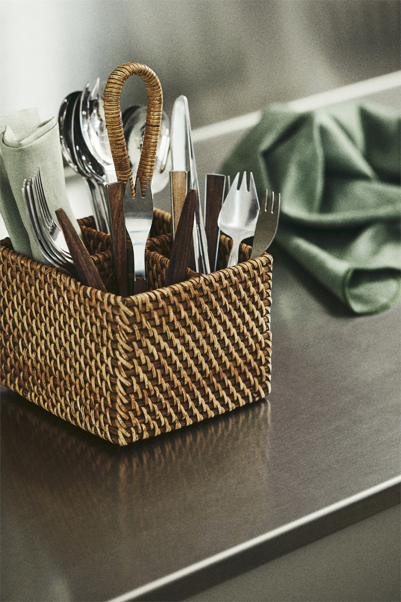 Квадратная корзина ручной работы с четырьмя одинаковыми по размеру отделениями для хранения столовых приборов, изготовленная из плетеного ротанга и оснащенная центральной ручкой для удобства переноски. Идеально подходит для транспортировки столовых приборов из кухни в сад или просто добавляет домашний уют к сервировке стола. Избегайте контакта с водой. Глубина 15 см. Ширина 15 см, высота с учетом ручки 22 см.