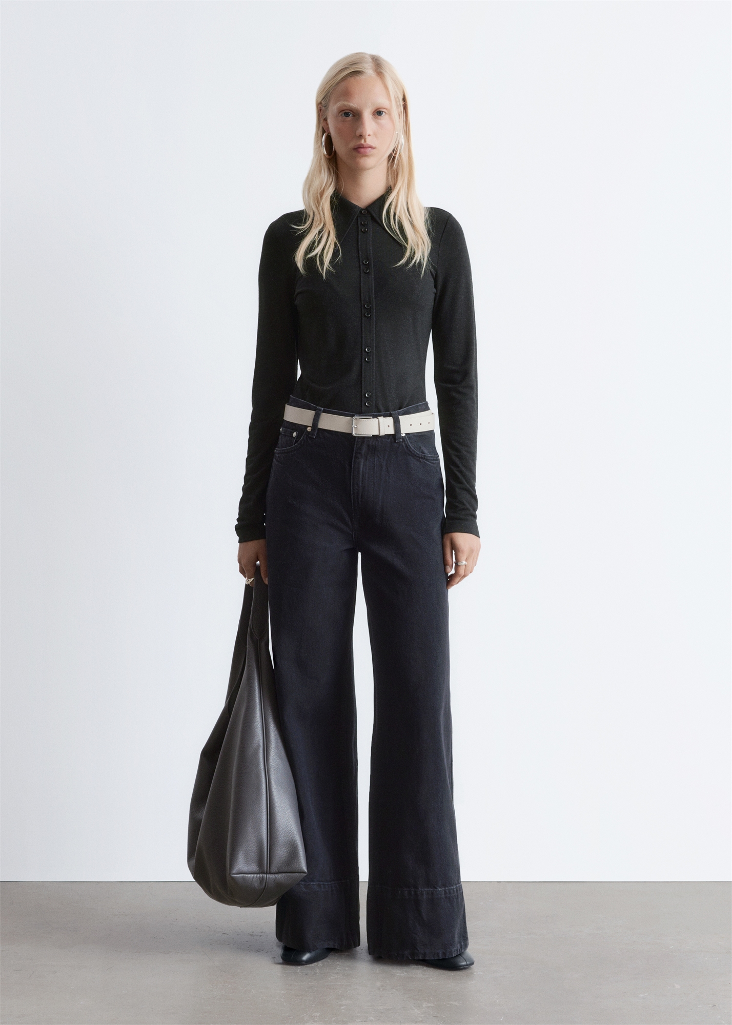 Джинсы с высокой талией, широкими штанинами и классической джинсовой отделкой с 5 карманами. Джинсы выполнены в строгом стиле 70-х годов и дополнены широким подолом с вышивкой. • Regular fit • Wide leg • Extra length • Belt loops • Zip fly with button closure Length of the inseam: 79.7cm / 31.3" (EU 38 / UK 10 / US 6)
