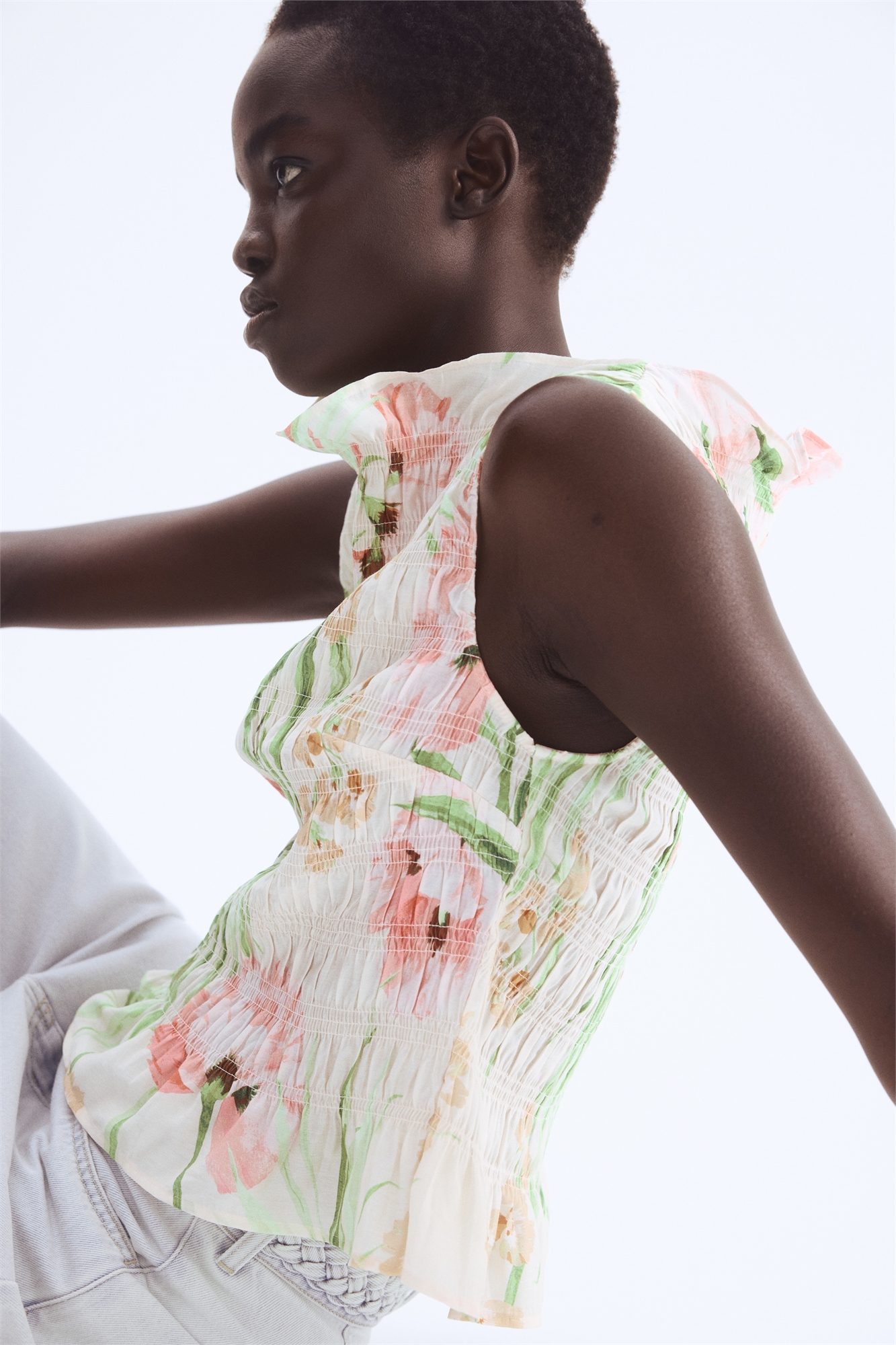 Облегающий топ без рукавов из тканого материала из смеси вискозы. Приталенный силуэт с вырезом-лодочкой и подолом-пеплумом.