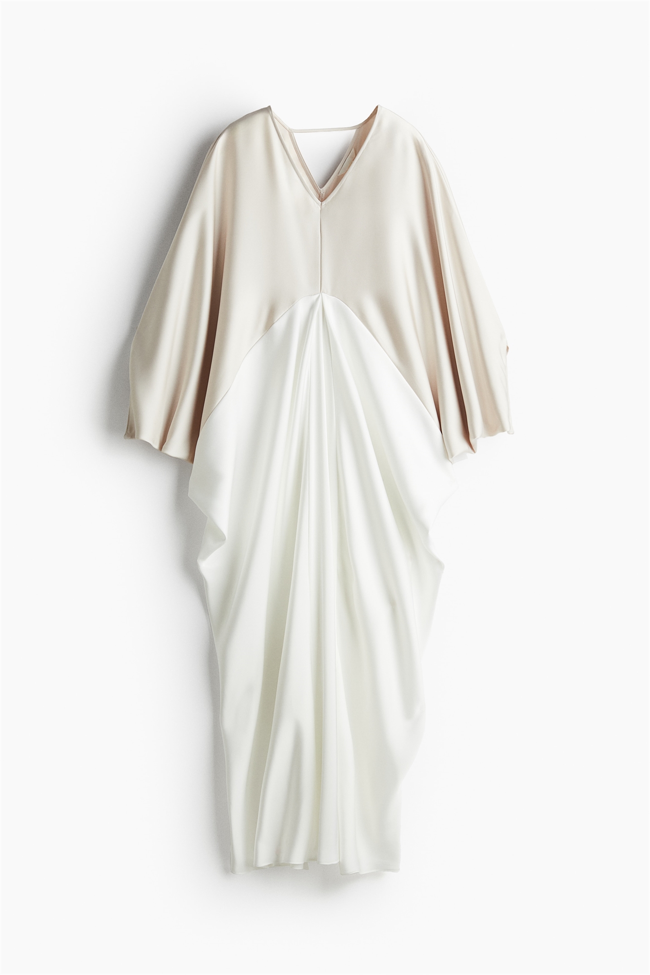 Свободное платье-кафтан из мягко драпирующегося атласа с V-образным вырезом спереди и V-образной проймой с фиксированной горизонтальной бретелью сзади. Широкие рукава длиной 3/4 и фигурный шов с перевернутой складкой спереди. Без подкладки.