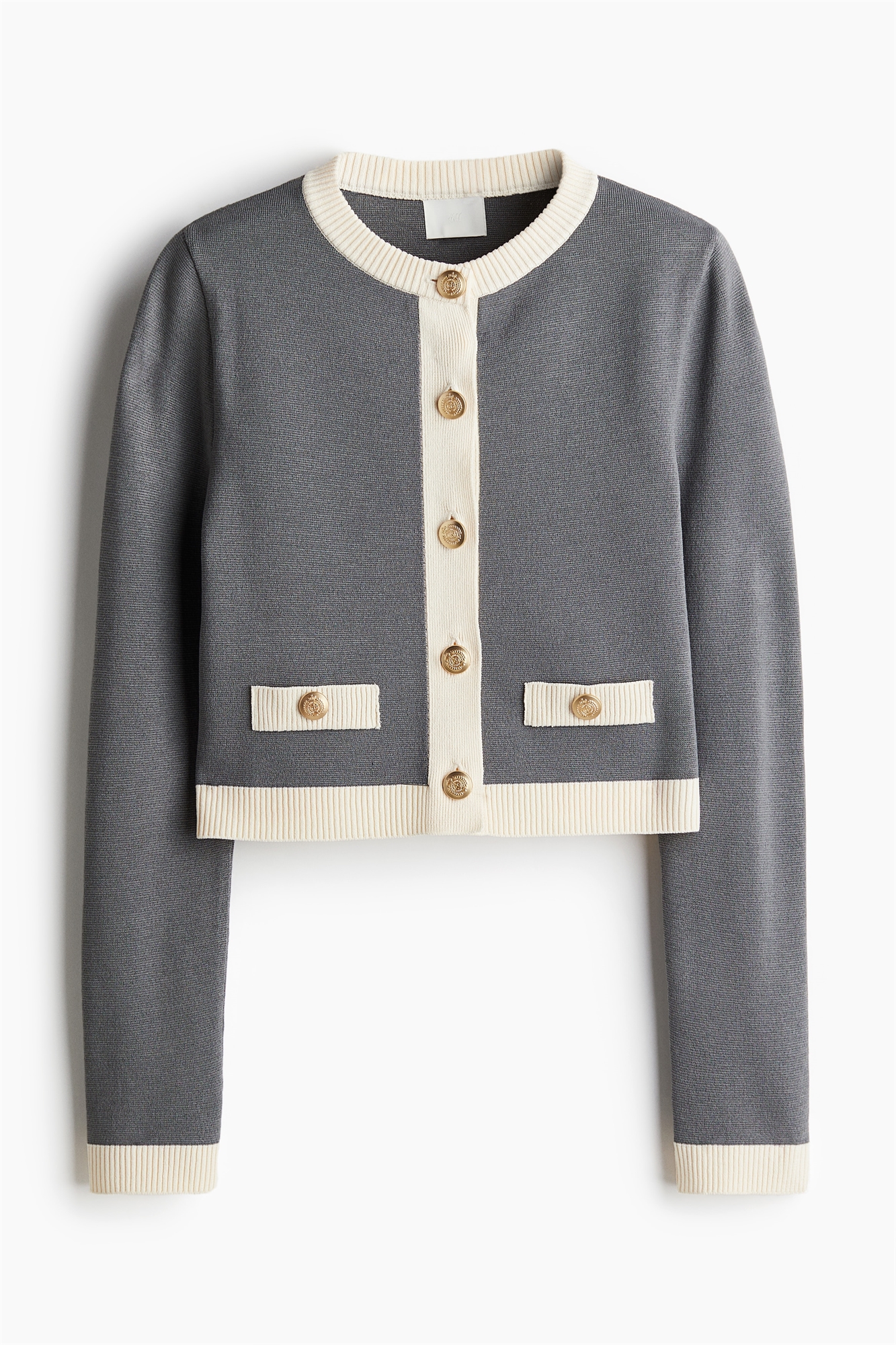 Короткий приталенный кардиган из мягкого тонкого трикотажа с круглым вырезом, металлическими пуговицами золотистого цвета спереди, длинными рукавами и втачными карманами с пуговицей спереди.