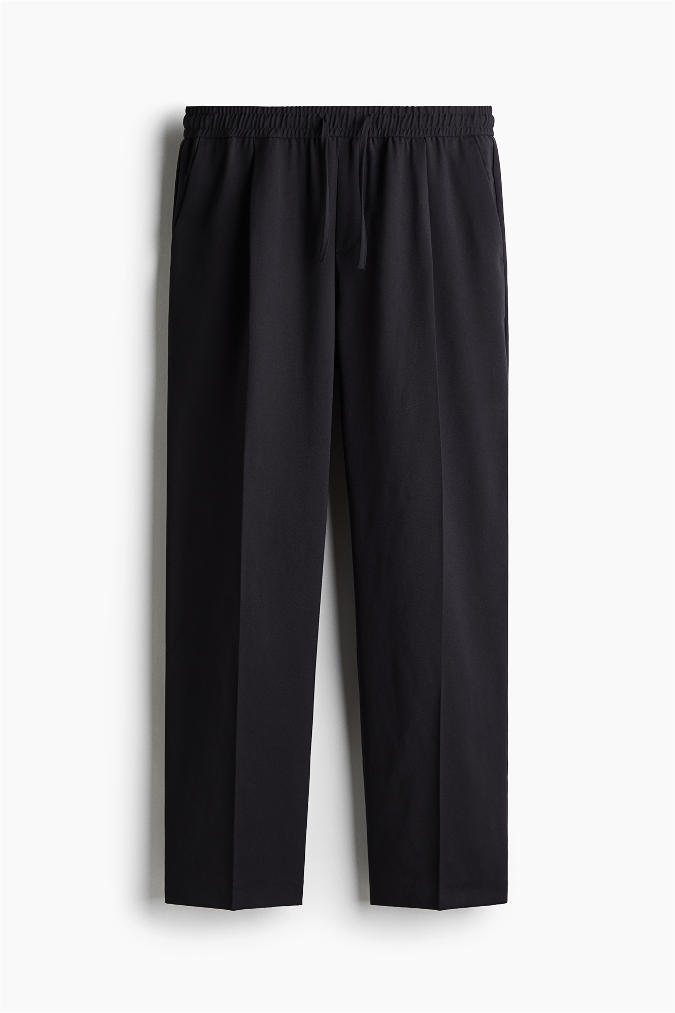 Брюки из мягкой ткани с эластичной отделкой и утягивающим поясом на талии, фальшивая ширинка, боковые и задние карманы. Ноги со складками. Регулярный крой для комфортной носки и классического силуэта.