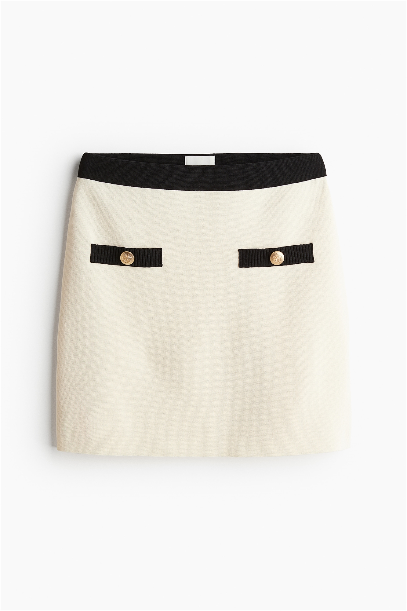 Короткая приталенная юбка из тонкого прочного трикотажа с деталями контрастного цвета. Высокая эластичная талия и втачные карманы с пуговицей спереди.