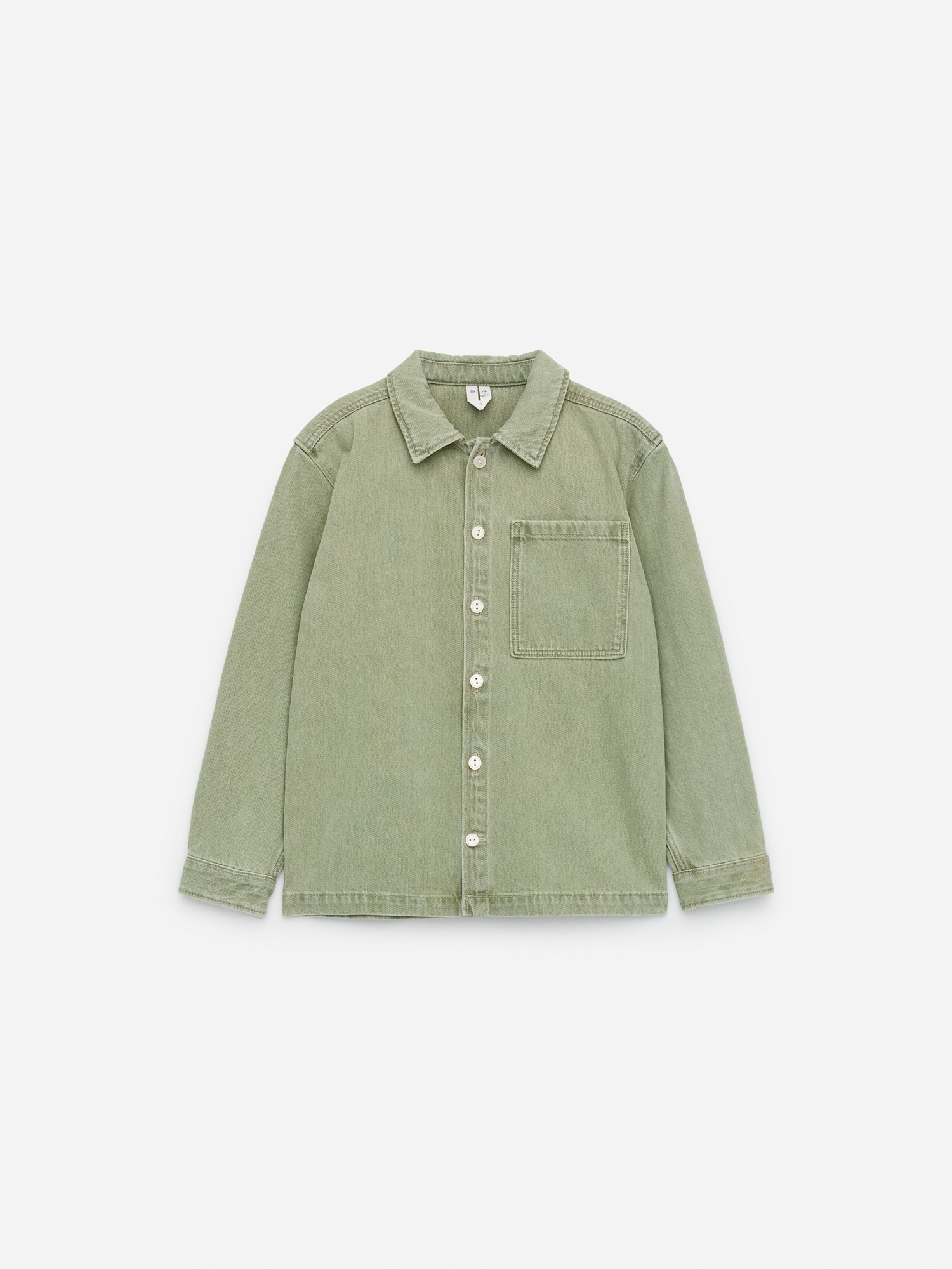 Куртка-рубашка из чуть более плотного денима с эффектом стирки. Застежка на пуговицы и один накладной карман на груди.