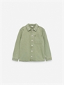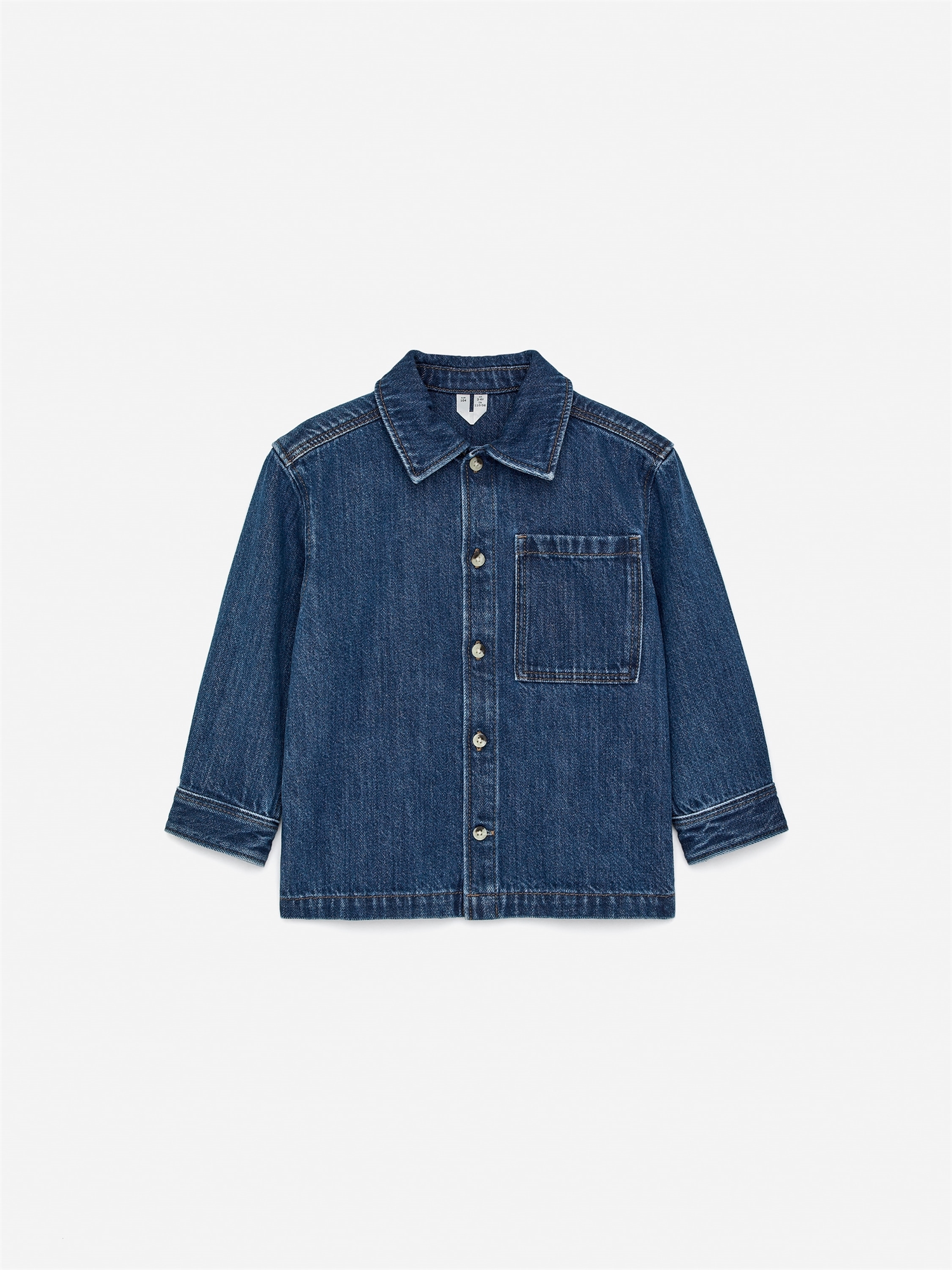 Куртка-рубашка из чуть более плотного денима с эффектом стирки. Застежка на пуговицы и один накладной карман на груди.