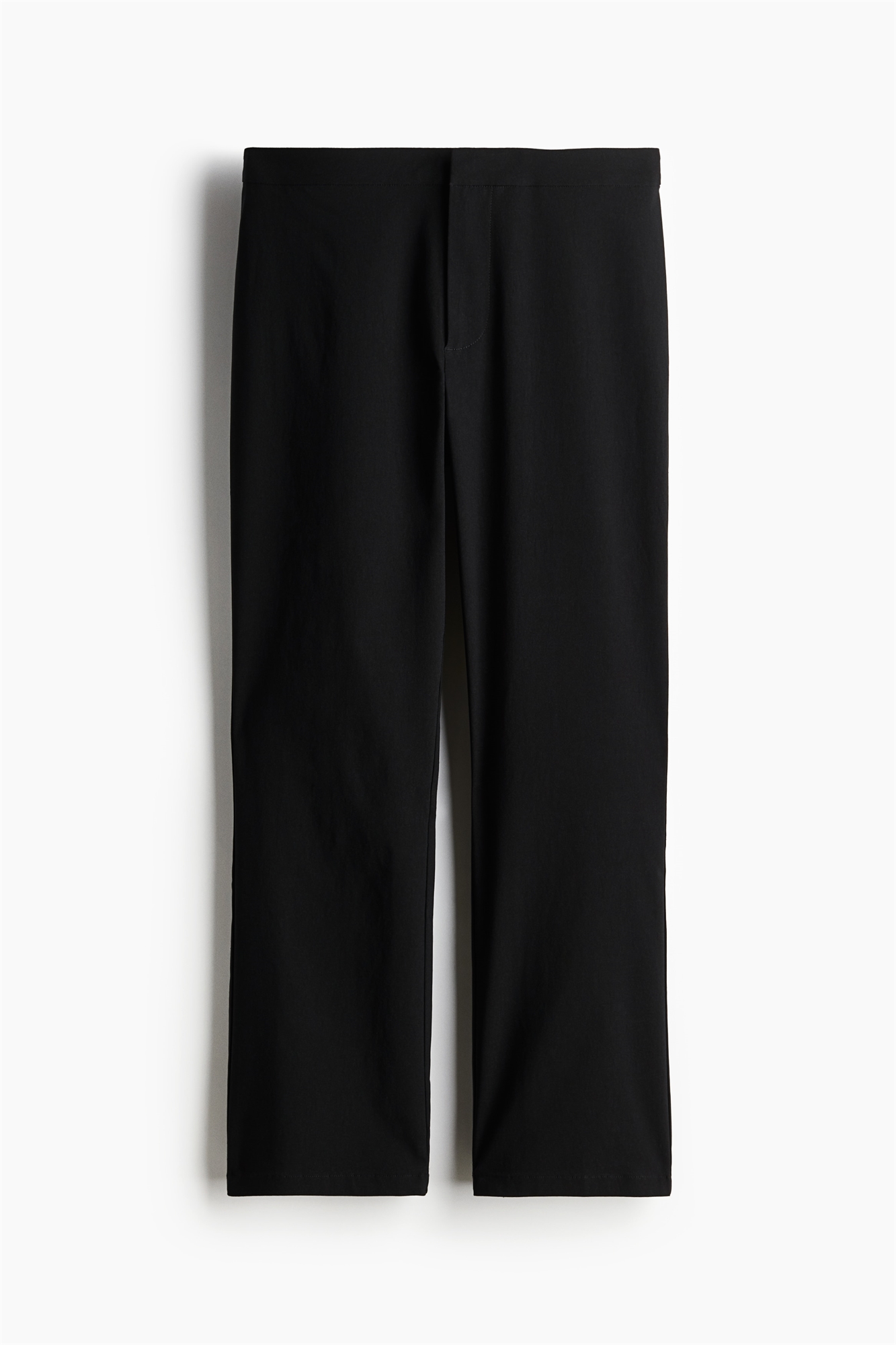 Обрезанные приталенные брюки из эластичного материала. Высокая талия, ширинка на молнии, потайная застежка на пуговицу и крючок.