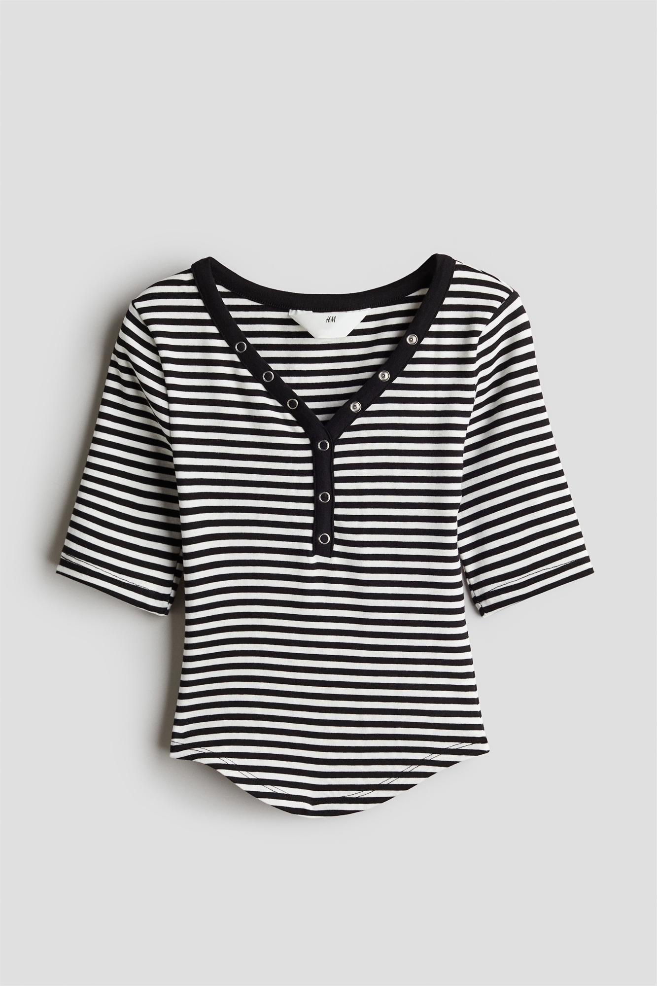 Топ из ребристого хлопкового джерси с V-образным вырезом горловины и декоративной застежкой с фальшивыми кнопками. Короткие рукава, заканчивающиеся чуть выше локтей. Закругленный подол.