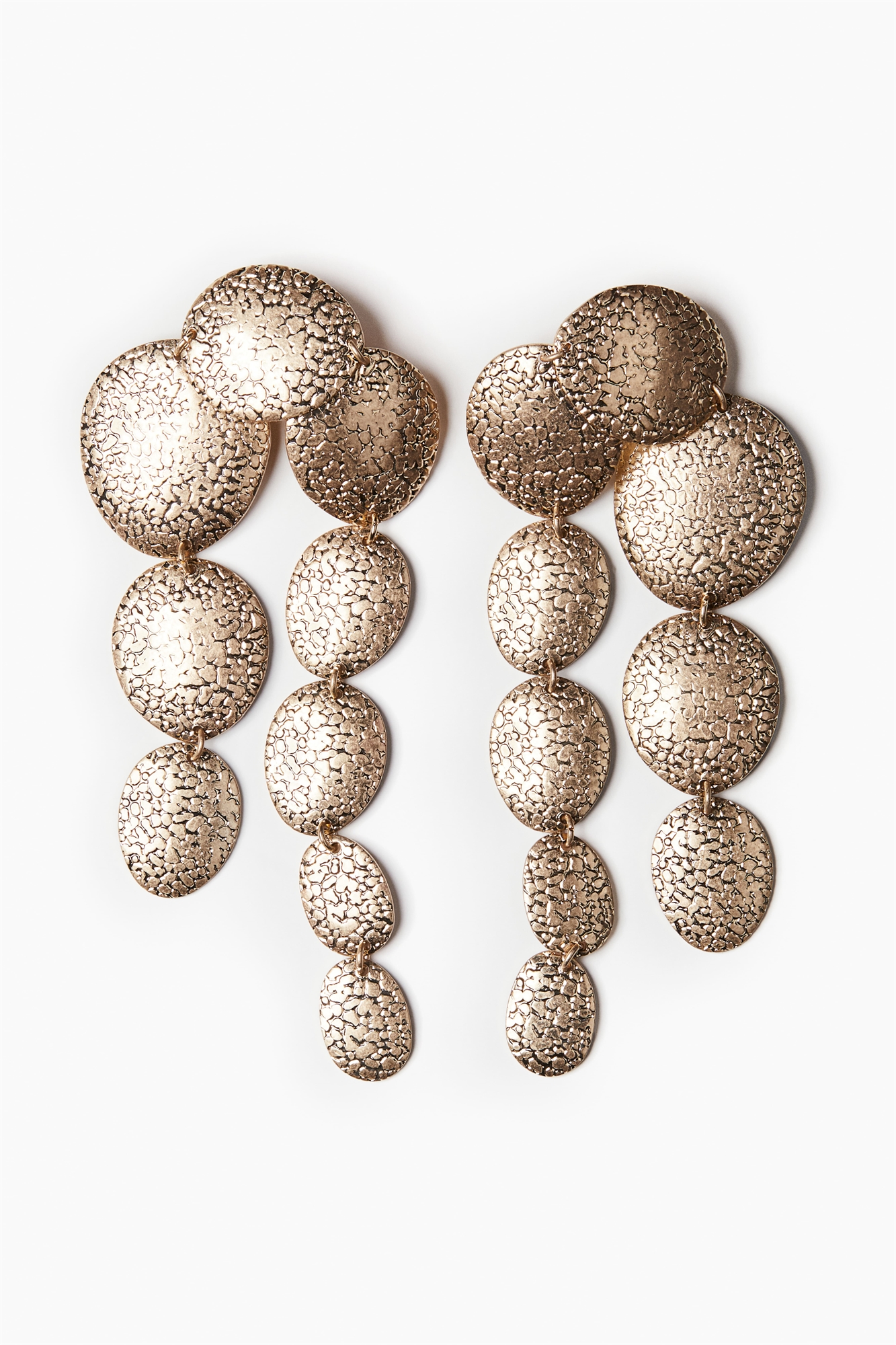 Серьги-подвески из переплетенных металлических дисков с крупнозернистой отделкой.