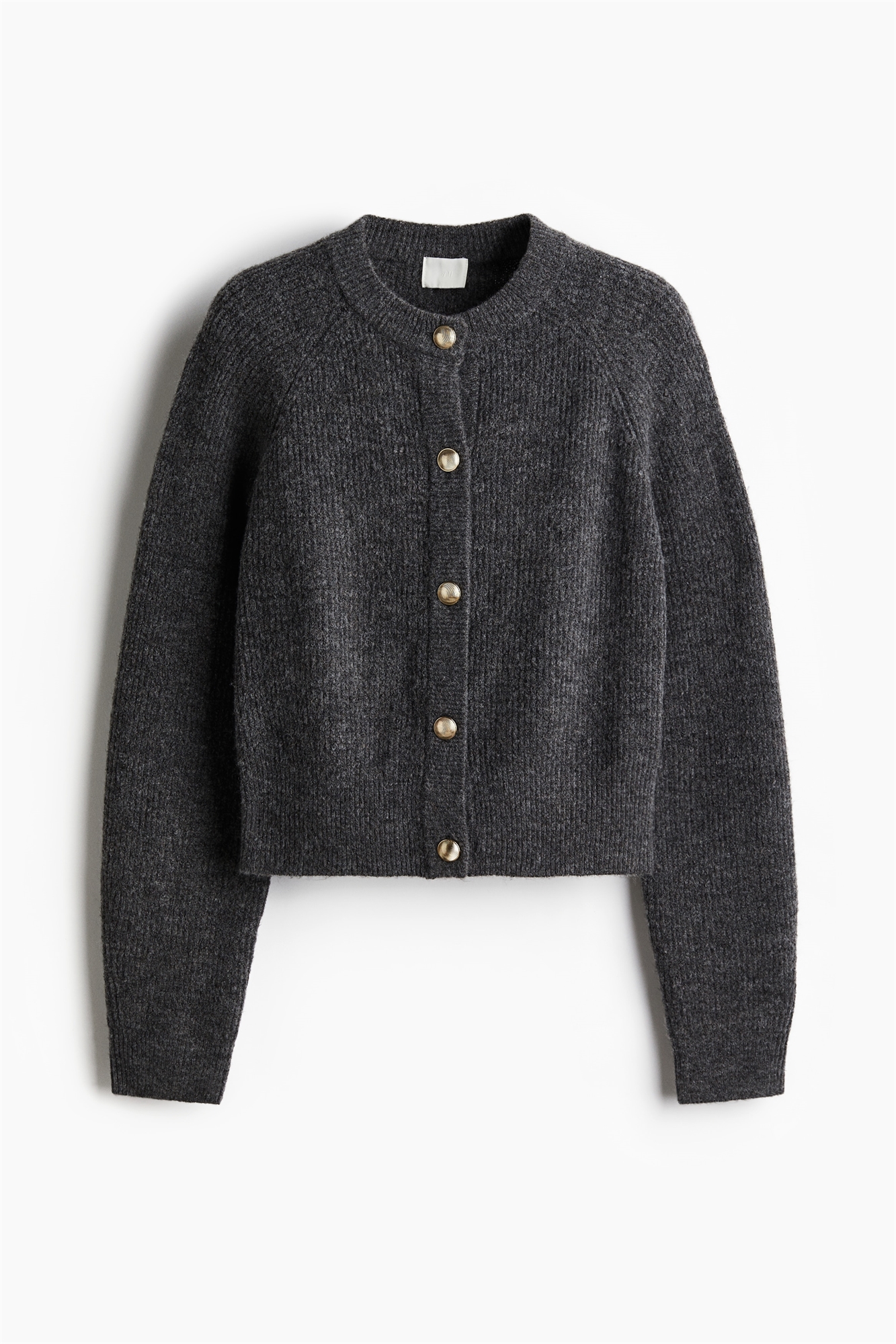 Короткий кардиган из мягкого трикотажа в рубчик с круглым вырезом, пуговицами спереди и длинными рукавами реглан с манжетами.