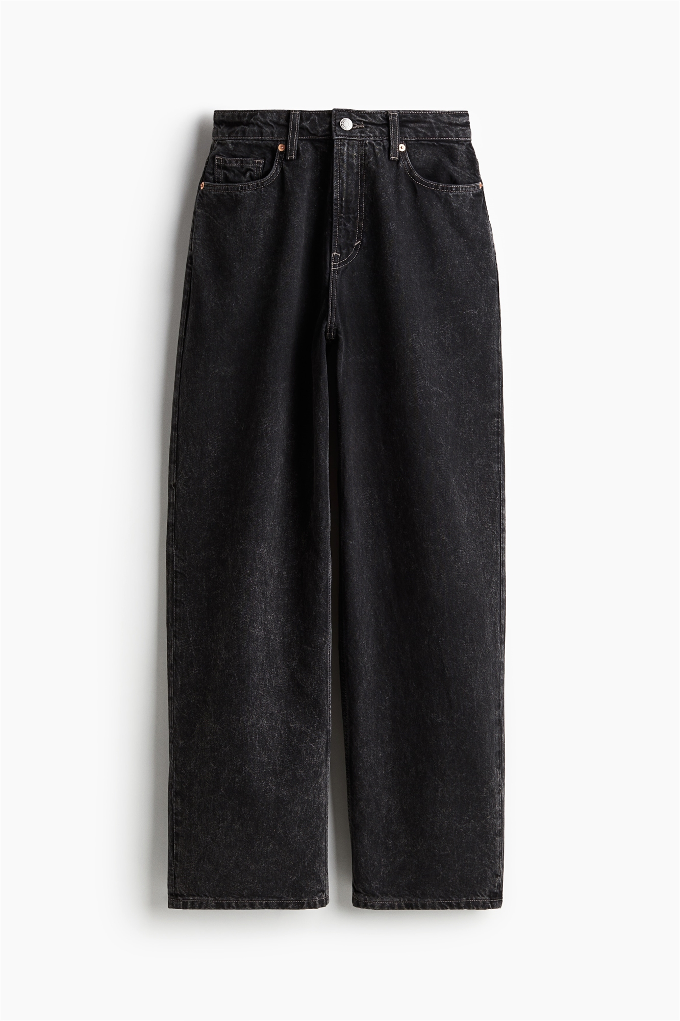 Джинсы с 5 карманами из жесткого денима, который сначала кажется твердым, но затем смягчается и ослабевает при носке. Прямые штанины со свободной посадкой от талии до бедра и мешковатой посадкой от бедра до подола. Высокая талия с ширинкой на молнии и пуговице. Удлиненная длина, созданная для того, чтобы ниспадать по ноге с эффектом укладки. Непринужденный и прохладный джинсовый образ.
