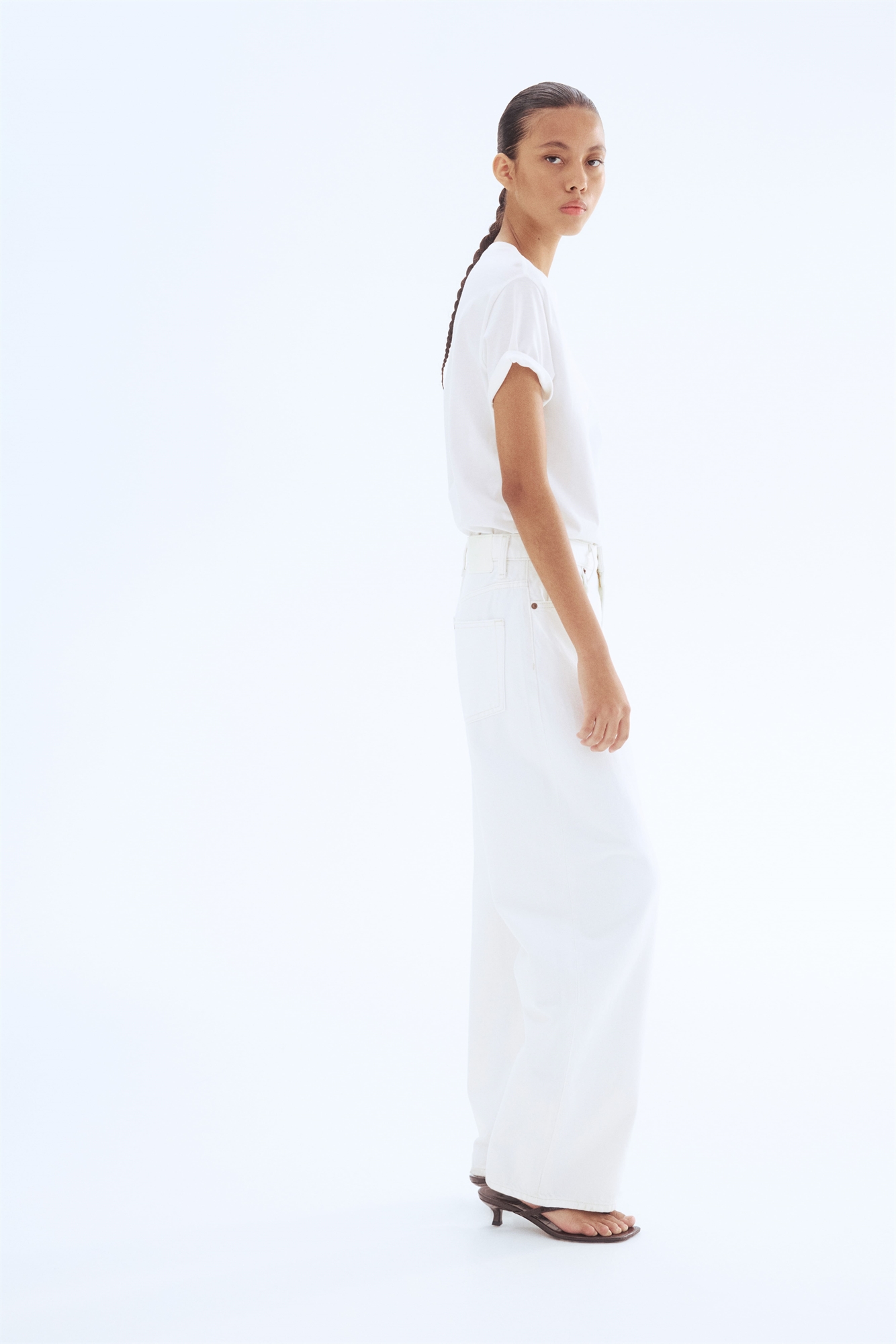Джинсы с 5 карманами из жесткого денима, который сначала кажется твердым, но затем смягчается и ослабевает при носке. Прямые штанины со свободной посадкой от талии до бедра и мешковатой посадкой от бедра до подола. Высокая талия с ширинкой на молнии и пуговице. Удлиненная длина, созданная для того, чтобы ниспадать по ноге с эффектом укладки. Непринужденный и прохладный джинсовый образ.