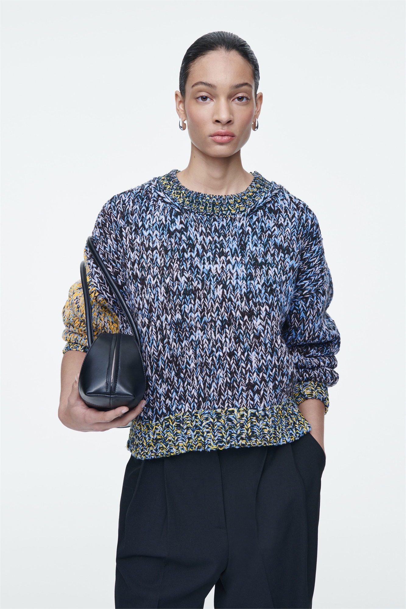 Смелый по цвету и фактуре, этот асимметричный джемпер связан вручную из шерстяной смеси RWS и частично с использованием отрезков ткани из ателье COS в синих, желтых, оранжевых и белых тонах. Она придаст яркий оттенок иным приглушенным образам. Регулярный крой В состав этого изделия входит шерстяное волокно Responsible Wool Standard TE-00047206 (RWS) с ферм, сертифицированных в соответствии с требованиями к благополучию животных и управлению земельными ресурсами Шелл: 99% шерсти RWS, 1% переработанного полиамида (переработанного нейлона). Без учета отделки / Ручная стирка Длина по спинке XS/S - 54 см, M/L - 58 см / Модель носит размер XS/S