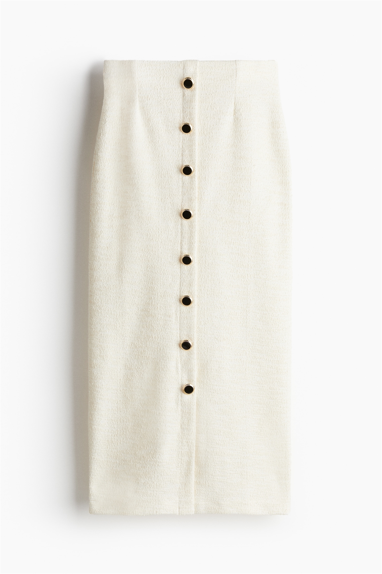 Приталенная юбка длиной до колен из фактурного джерси с эластичной талией и декоративными пуговицами спереди.