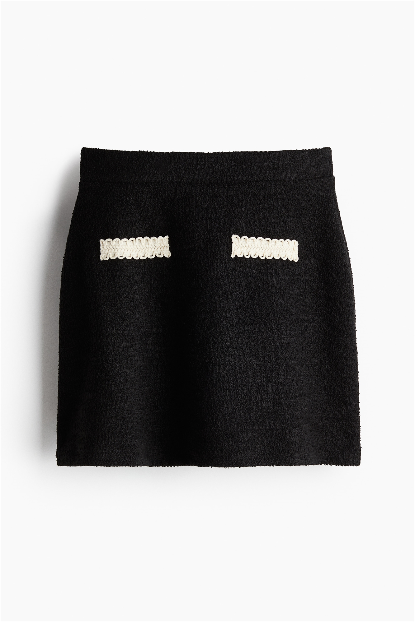 Короткая юбка А-линии из фактурного джерси с высокой эластичной талией и прорезными передними карманами с вышитой деталью акцентного цвета.