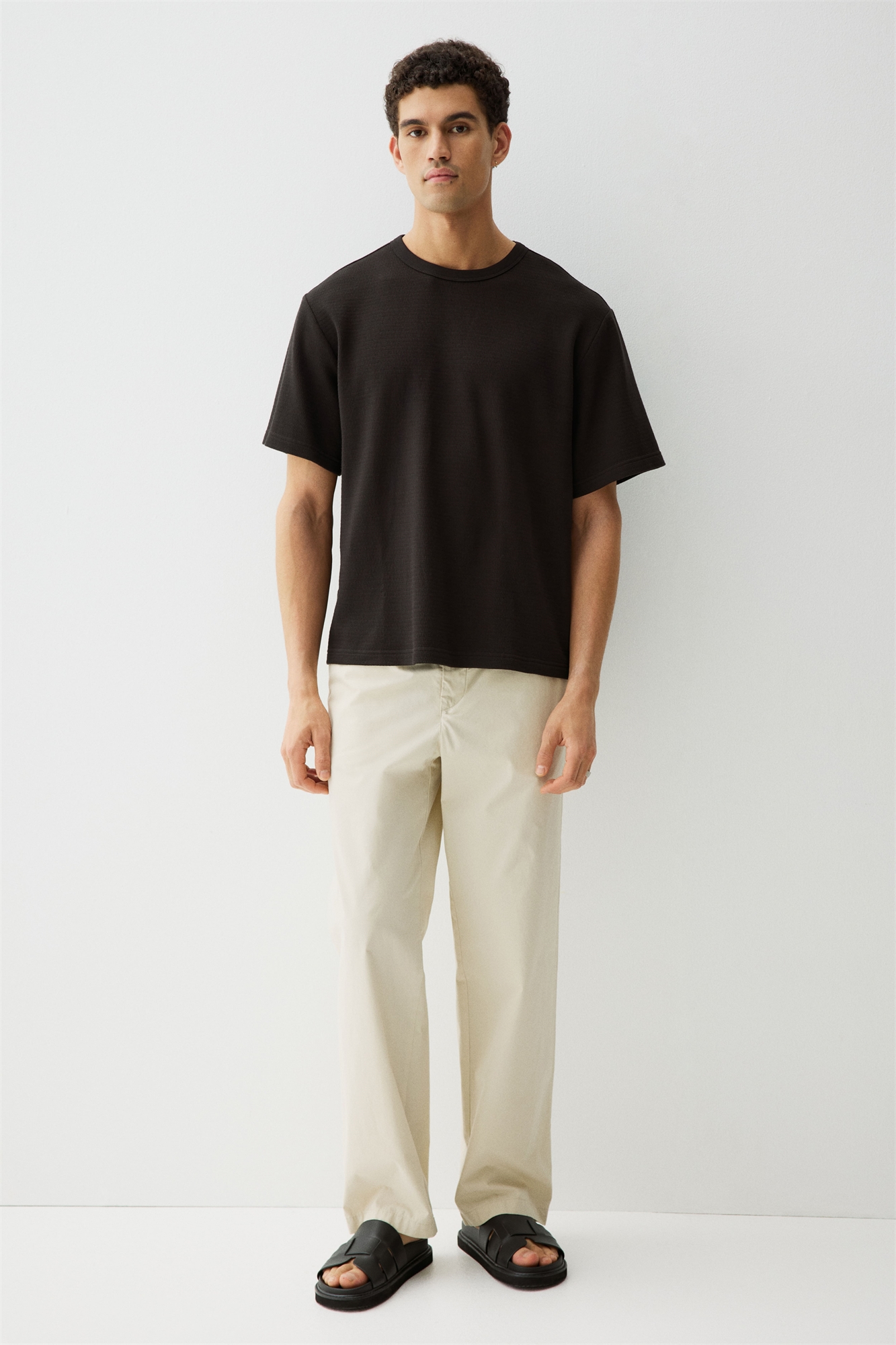 Футболка из плотного вафельного хлопкового джерси с круглым вырезом в рубчик и прямым покроем. Регулярный крой для комфортного ношения и классического силуэта.