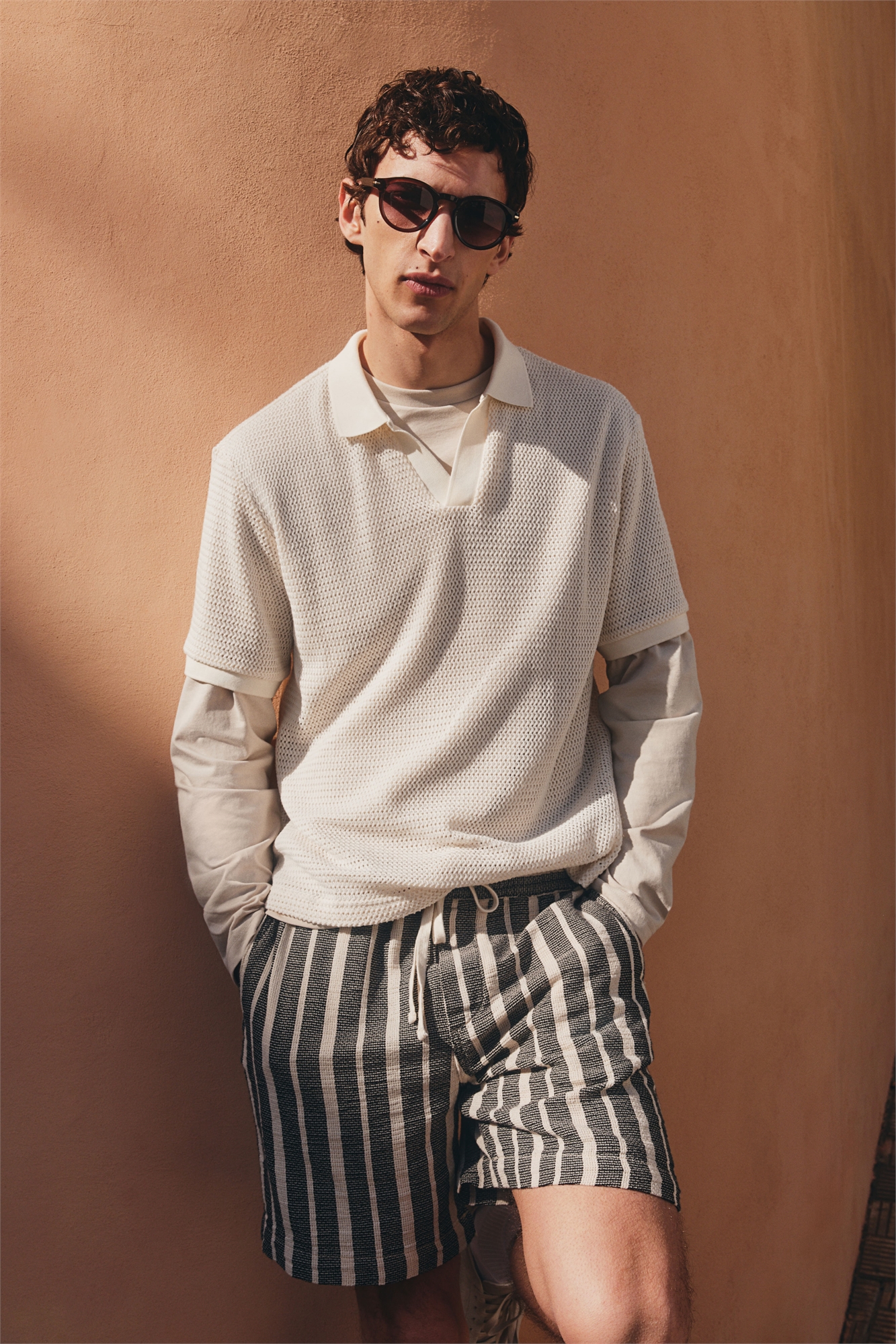 Рубашка-поло из хлопкового трикотажа с дырками, ребристым воротником, V-образной проймой в верхней части и манжетами с ребристой отделкой. Регулярный крой для комфортной носки и классического силуэта.