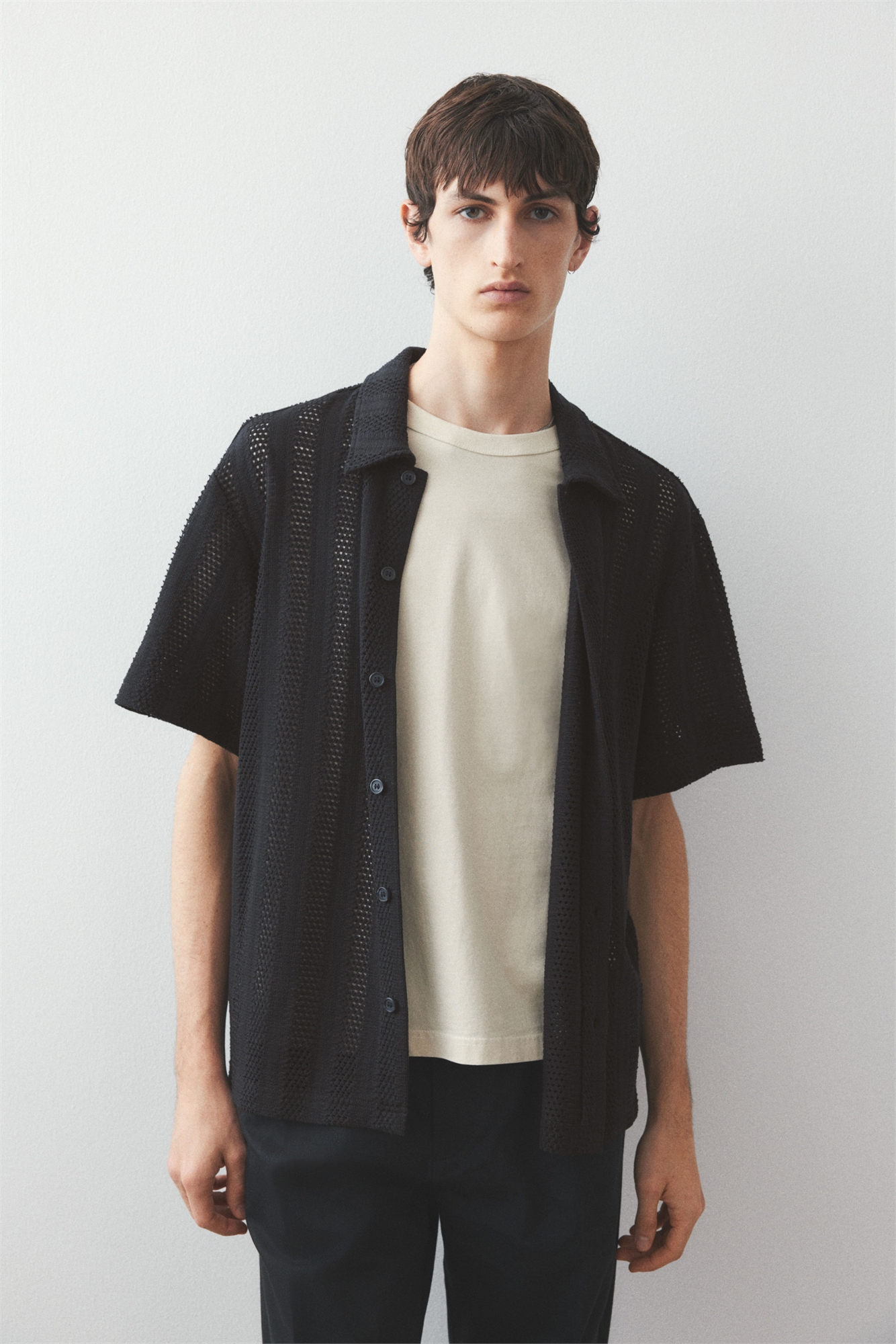 Рубашка с короткими рукавами из мягкого вафельного джерси с курортным воротником, французским передом, спущенными плечами и прямым подолом с разрезом по бокам. Свободный крой для пышного, но не чрезмерно большого силуэта.