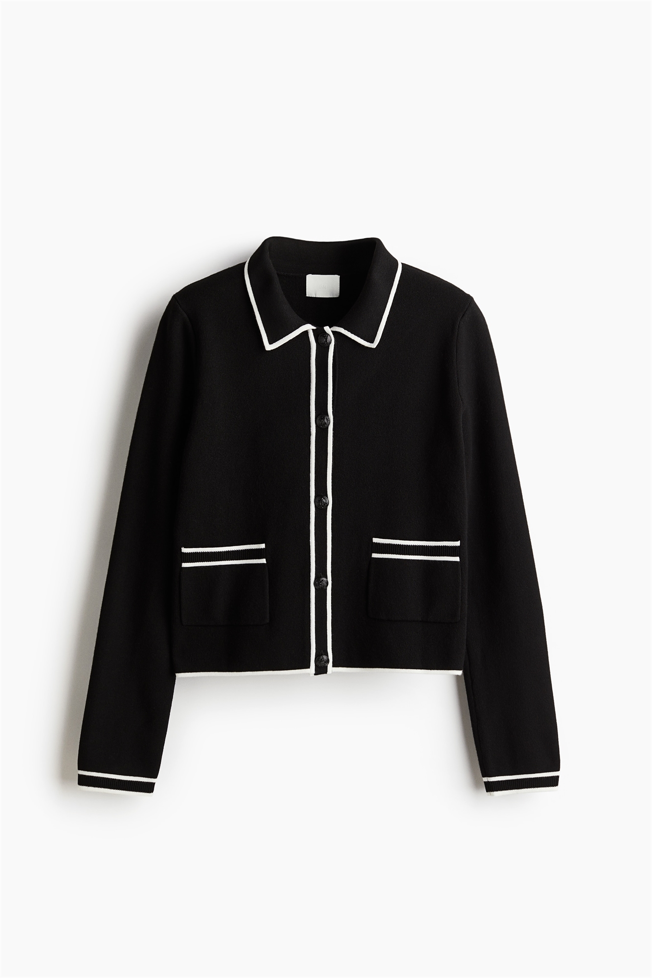 Короткий приталенный кардиган из плотного трикотажа с отделкой контрастного цвета. Воротник, застежка на пуговицы спереди, длинные рукава и накладные передние карманы. Ребрышки на проймах карманов и манжетах.