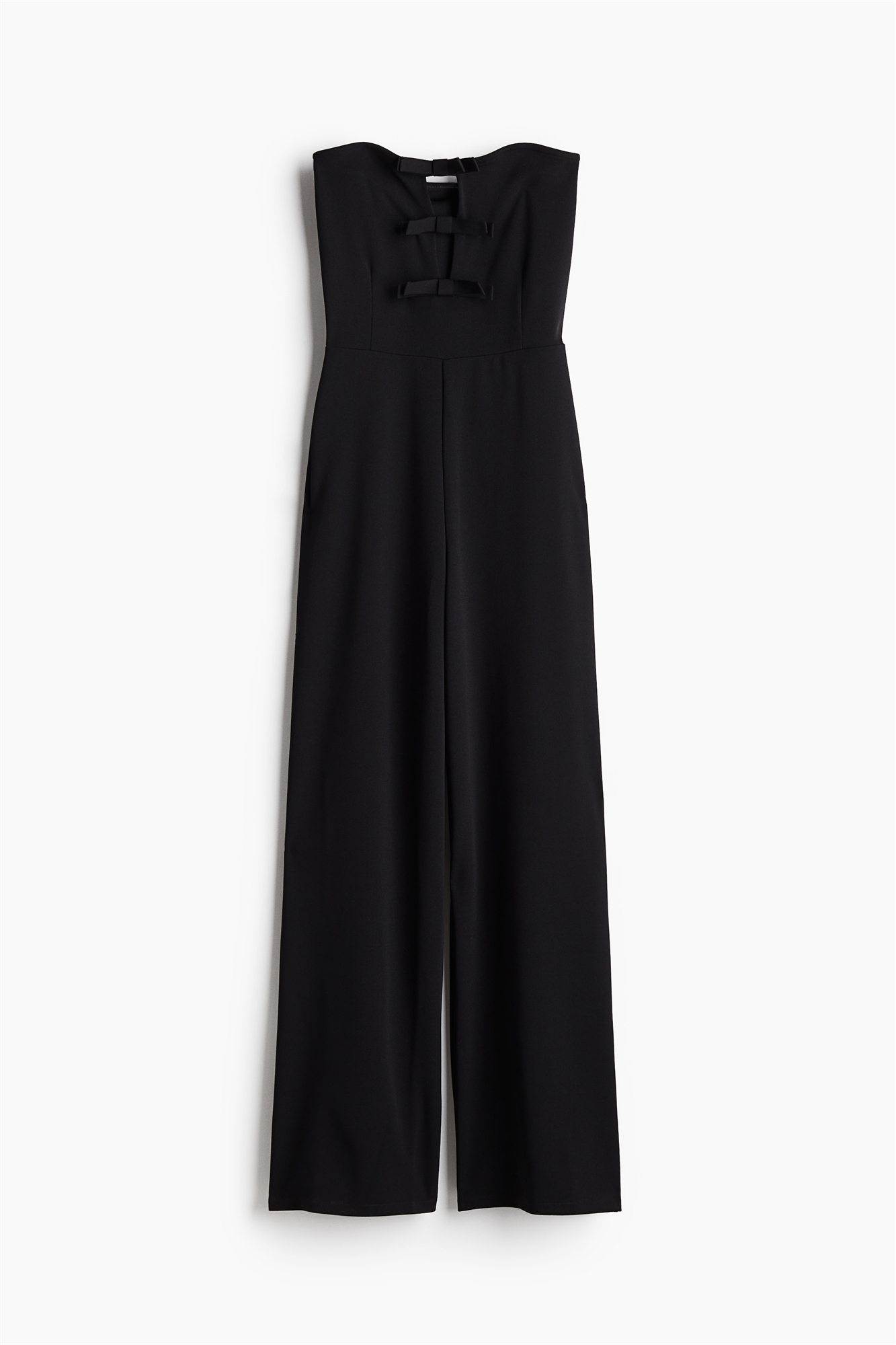 Приталенный лиф с силиконовой отделкой в верхней части и V-образной проймой с декоративными бантами спереди. Фигурные вытачки, шов на талии и прямые ноги.
