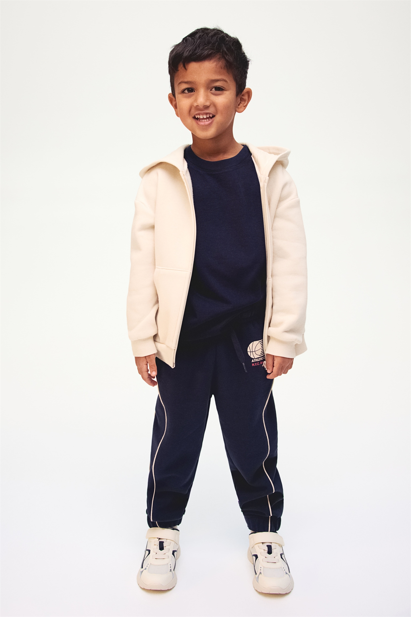 Джоггеры из легкой толстовочной ткани с принтом на одной штанине. Эластичный пояс с завязками, боковые карманы и отделка по ногам. Эластичная резинка по краям.