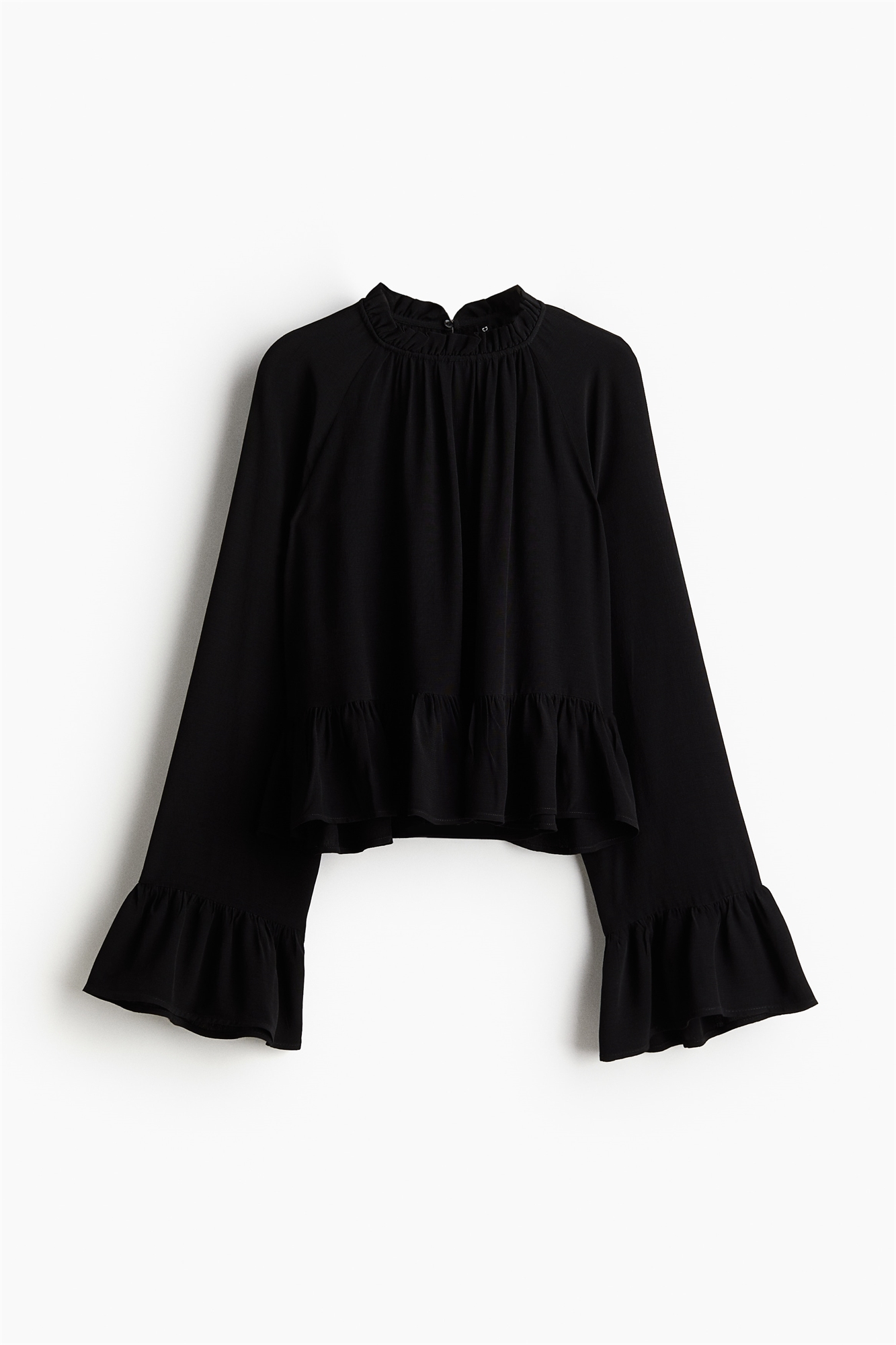Свободная блузка из воздушного вискозного полотна с жатым воротником и застежкой на пуговицы и петли сзади на шее. Длинные рукава реглан с широким воланом на манжетах и расклешенным пеплумом.