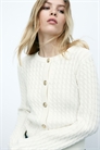 Короткий приталенный кардиган из мягкого хлопкового микса кабельной вязки. Круглый вырез, металлические пуговицы спереди и тесемки вокруг выреза, по пуговичной ленте, на манжетах и подоле.