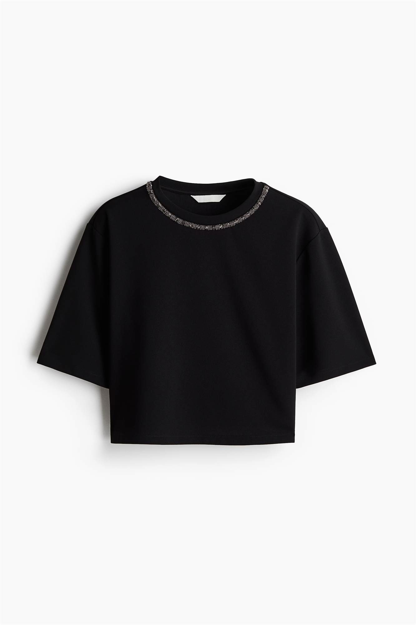 Короткая футболка из джерси с круглым вырезом. Свободный крой, слегка спущенные плечи и прямой подол.