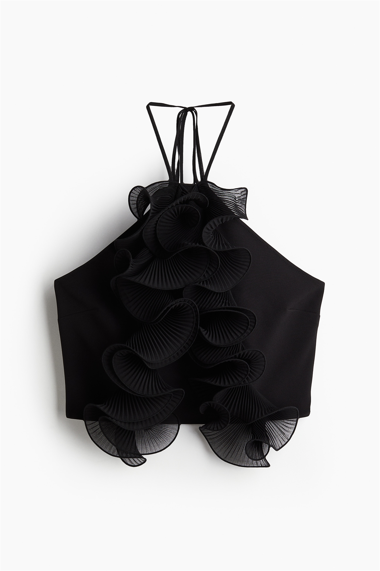 Короткий приталенный топ из тканого материала с узкими завязками и декоративной отделкой рюшами спереди.
