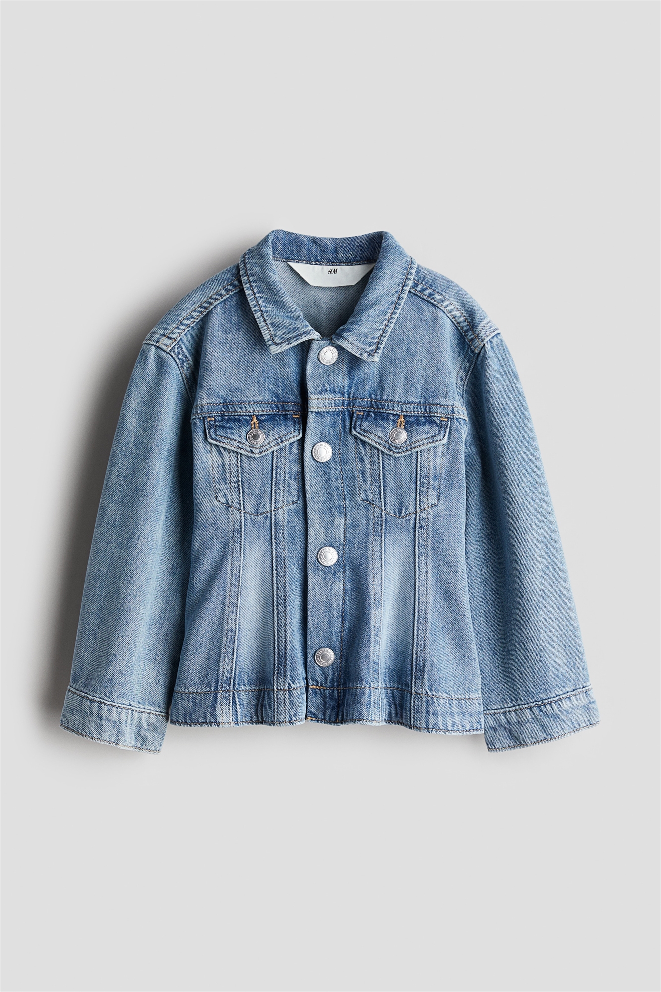 Куртка из стираного хлопкового денима с воротником, застежками на кнопках спереди, накладными нагрудными карманами с застежкой на кнопках и длинными рукавами с застежкой на манжетах. Аккуратный крой от талии до подола.