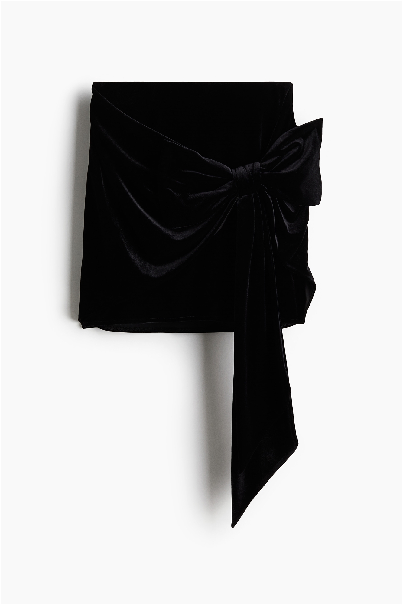 Короткая приталенная юбка из мягкого велюра со скрытой эластичной резинкой на талии и формирующими вытачками сзади. Перекрывающийся разрез спереди украшен большим бантом с ниспадающими хвостами с одной стороны. На подкладке.