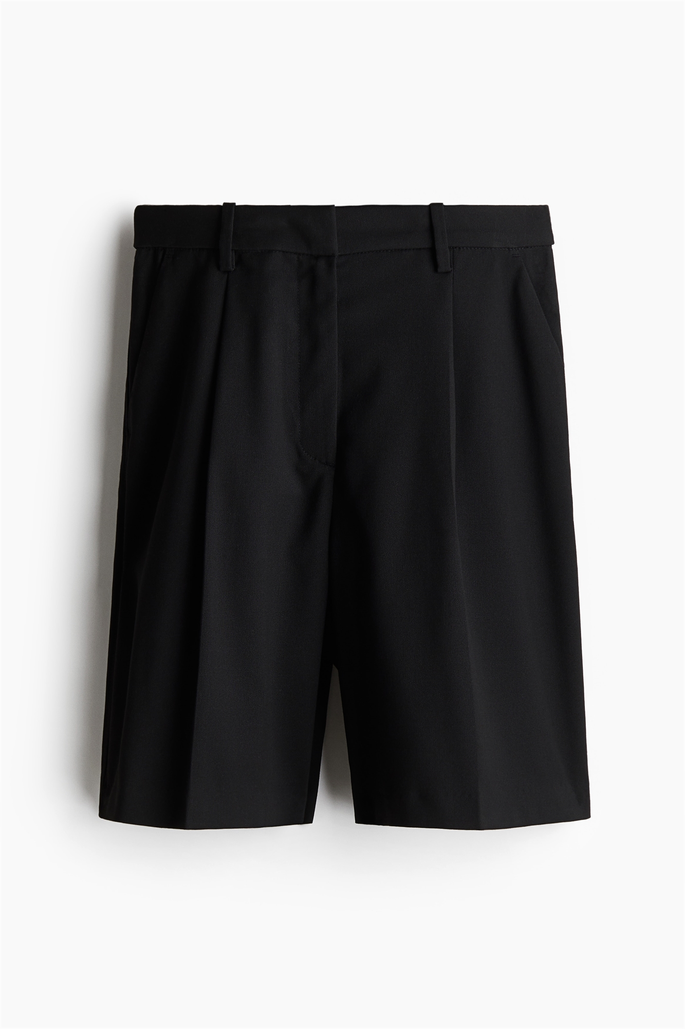 Шорты длиной до колена из саржи с высокой талией, ширинкой на молнии и потайной застежкой на пуговицу и крючок. Свободный крой с диагональными боковыми карманами, втачными задними карманами, складками спереди и складками спереди и сзади.