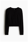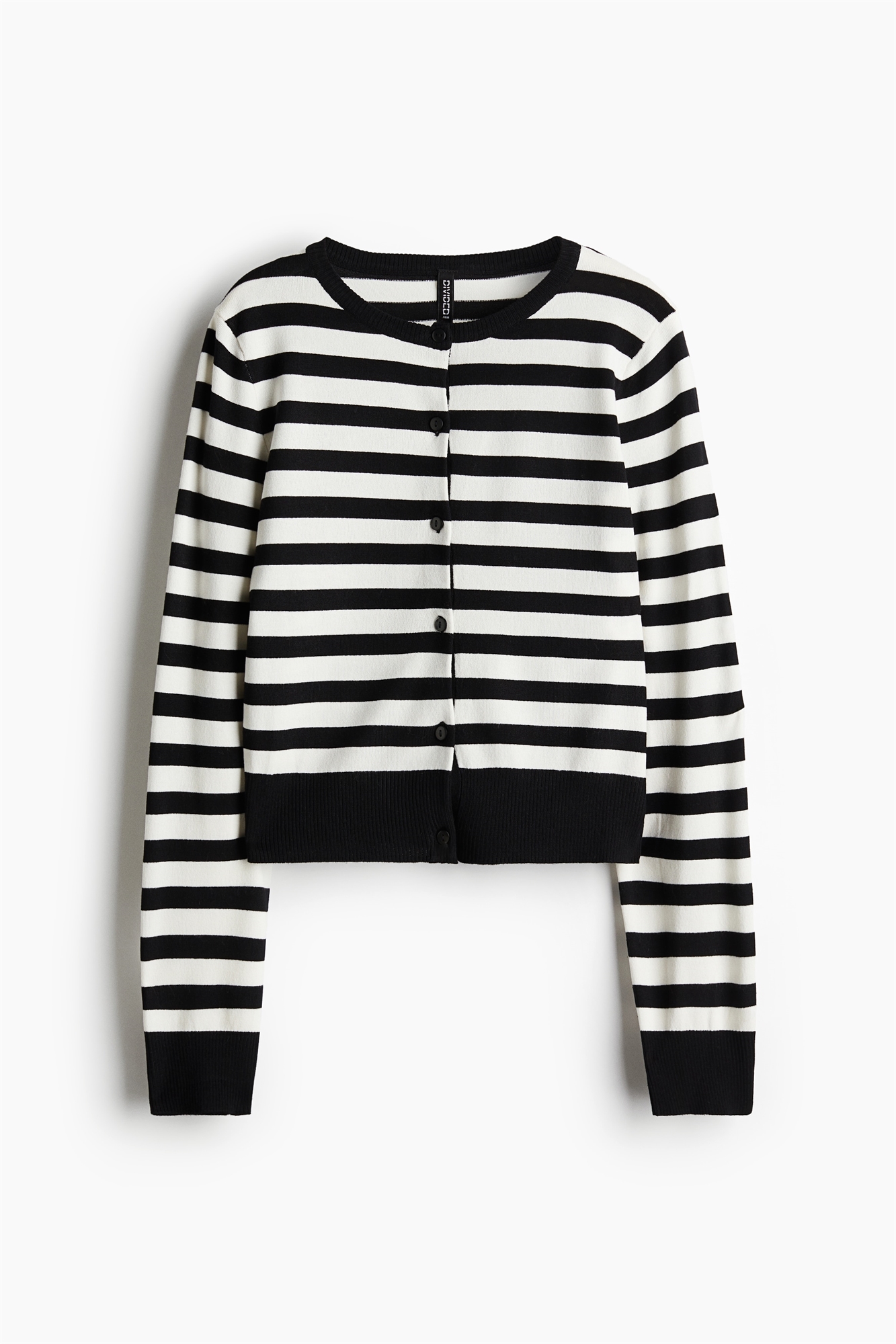 Приталенный кардиган из мягкого тонкого трикотажа с круглым вырезом, отделанным ребрами, пуговицами спереди и длинными рукавами. Манжеты и подол отделаны ребрами жесткости.
