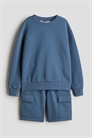 Комплект из топа и шорт из толстовки с мягким начесом внутри. Топ с круглым вырезом в рубчик, спущенными плечами и окантовкой манжет и подола. Шорты с эластичной утягивающейся талией, фальшивой ширинкой, боковыми карманами и накладными карманами на ногах.