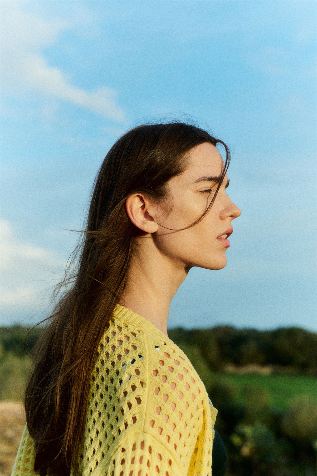 Короткий кардиган из мягкой дырчатой вязки с круглым вырезом, пуговицами спереди, слегка спущенными плечами и длинными рукавами. Окантовка вокруг выреза, по краю пуговиц, на манжетах и подоле.