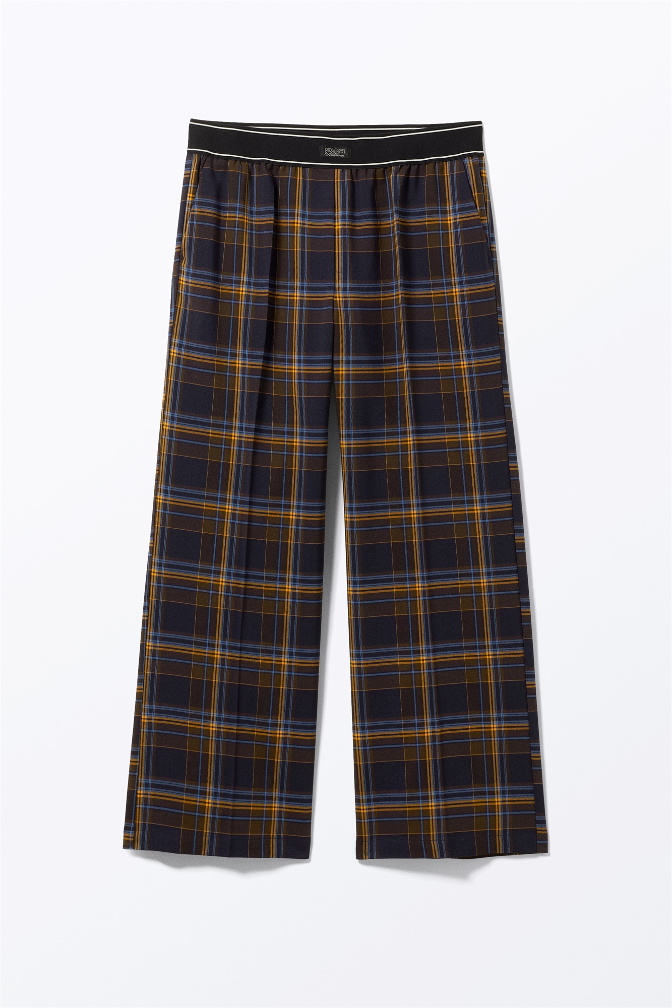 Пара свободных костюмных брюк с низкой талией, эластичным поясом с логотипом, косыми боковыми карманами, задними накладными карманами и передними складками. Свободный крой. Заниженная талия. Эластичный пояс. Прошитый лейбл. Косые карманы. Прорезные карманы. Прессовые складки.