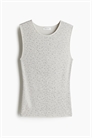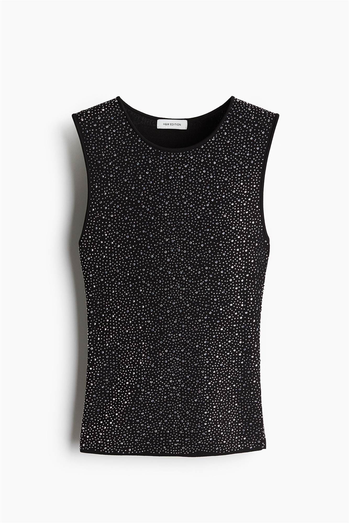 Облегающий жилет-топ из плотного трикотажа, украшенный сверкающими стразами разного размера. Круглый вырез и узкая трубчатая отделка по вырезу и проймам.