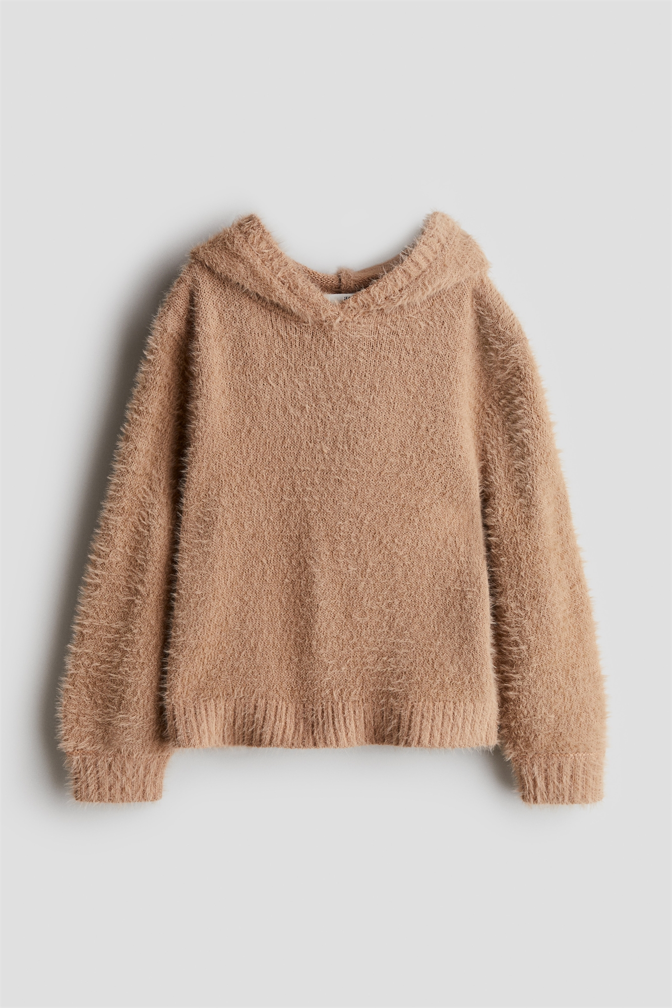 Топ из пушистого тонкого трикотажа с капюшоном, спущенными плечами и завязками на манжетах и подоле.