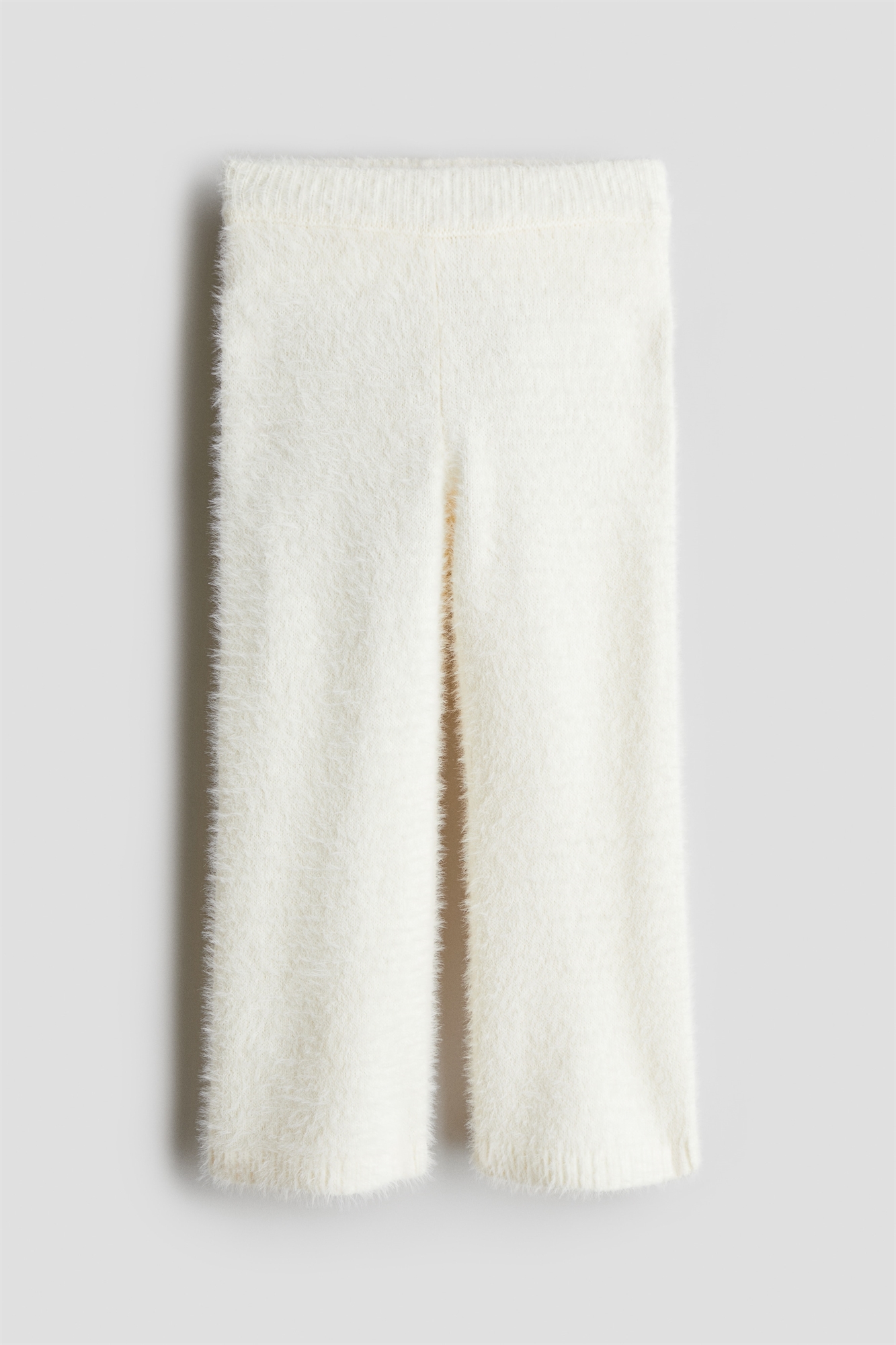 Леггинсы из пушистого тонкого трикотажа с эластичным поясом и расклешенными ногами с завязками по краям.